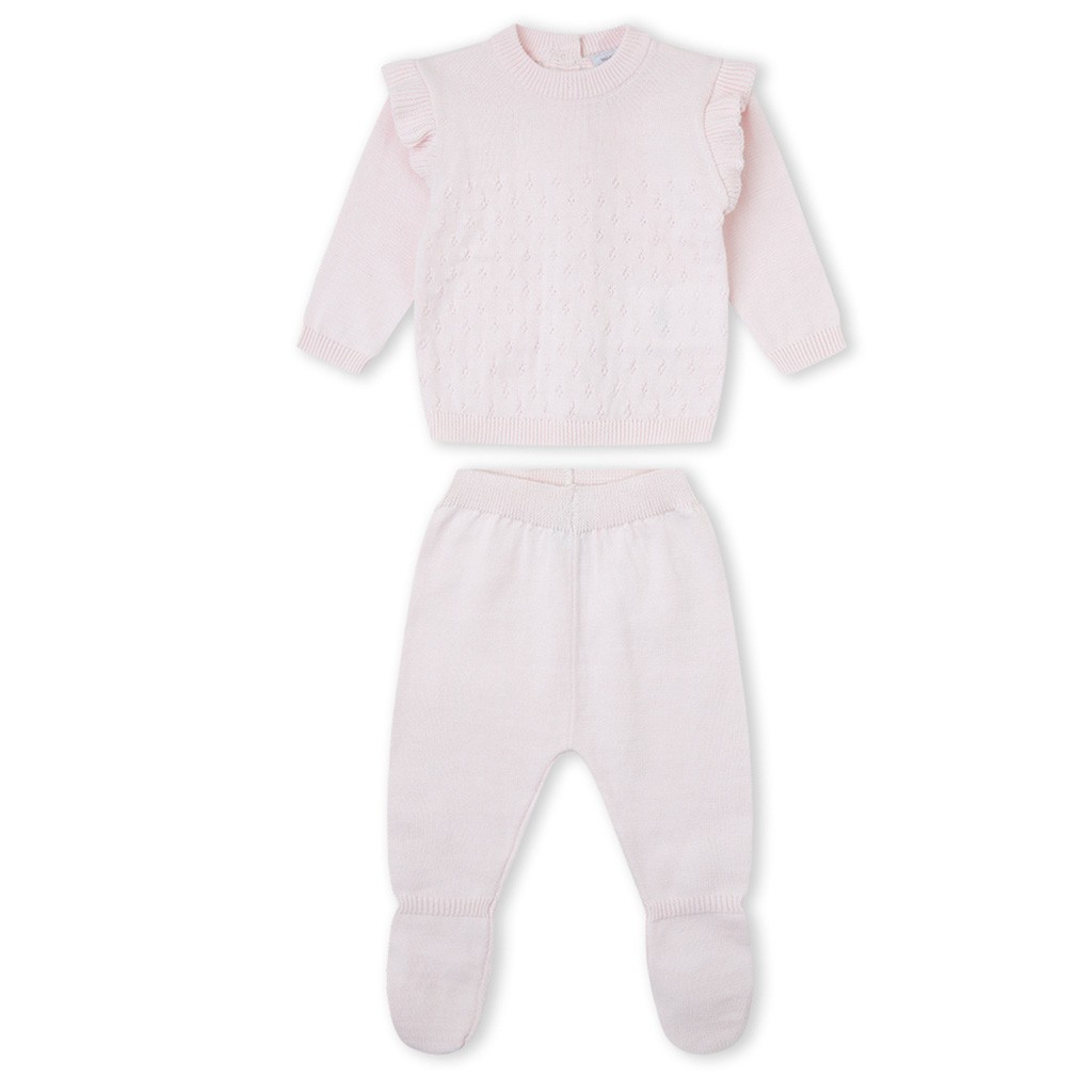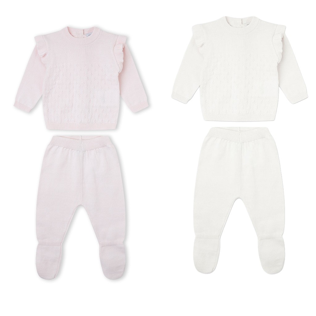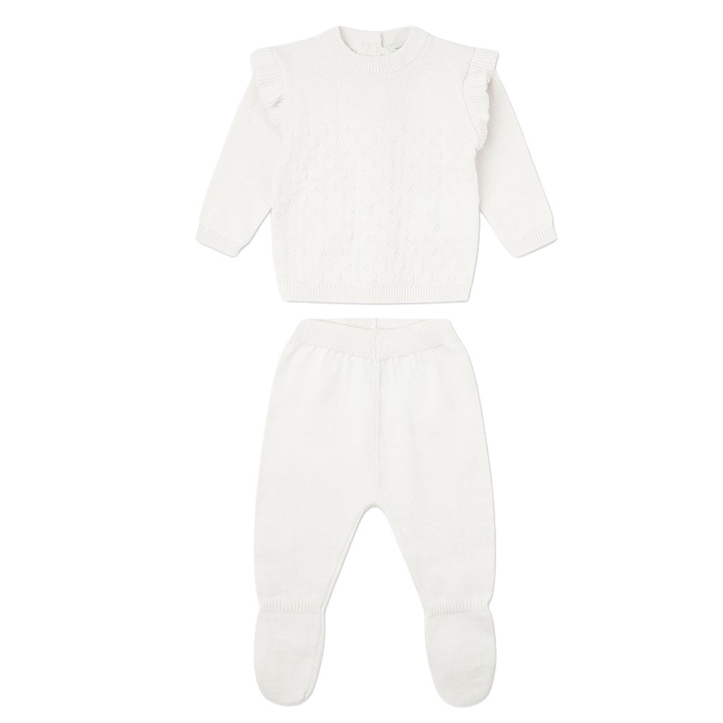 Conjunto para bebé de punto algodón, compuesto por jerseicito de manga larga con volante en los hombros y polaina. Presentado en caja. De la marca Yatsi.
