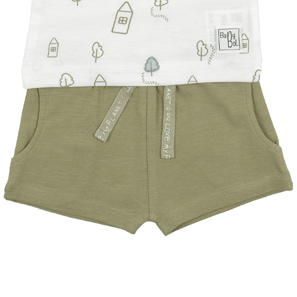 Conjunto de dos piezas para bebé, en tejido de algodón, compuesto por camiseta de manga corta estampada con bolsillo y pantalón corto en color liso con cordón ajustable. Presentado en caja. Marca Babybol.