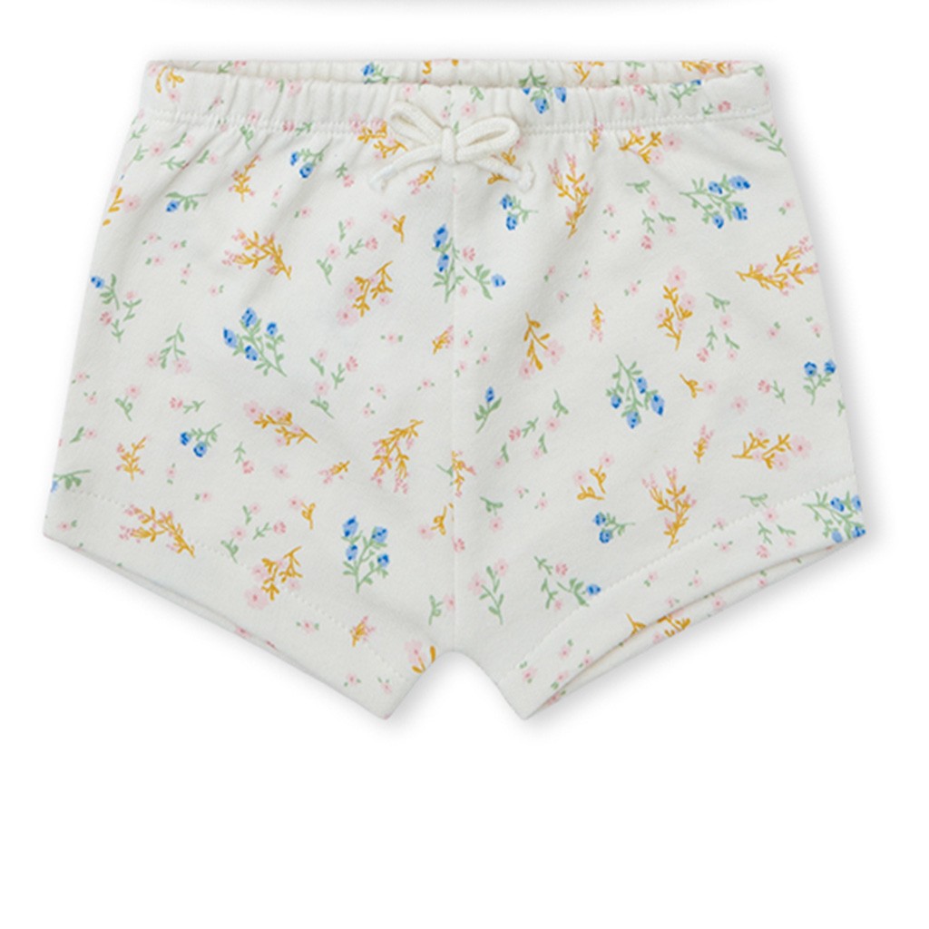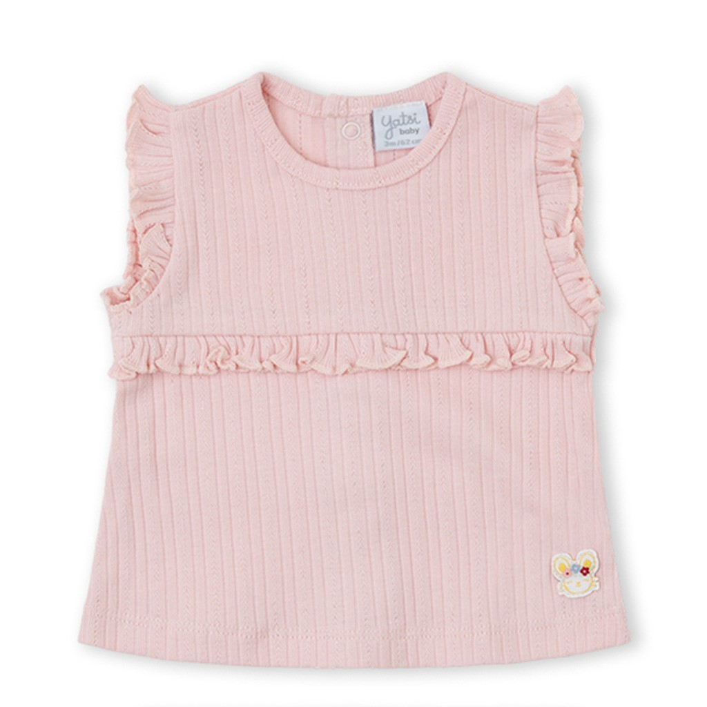 Conjunto para bebé compuesto por camiseta de canalé con volantes y pantaloncito corto estampado. De la marca Yatsi.
