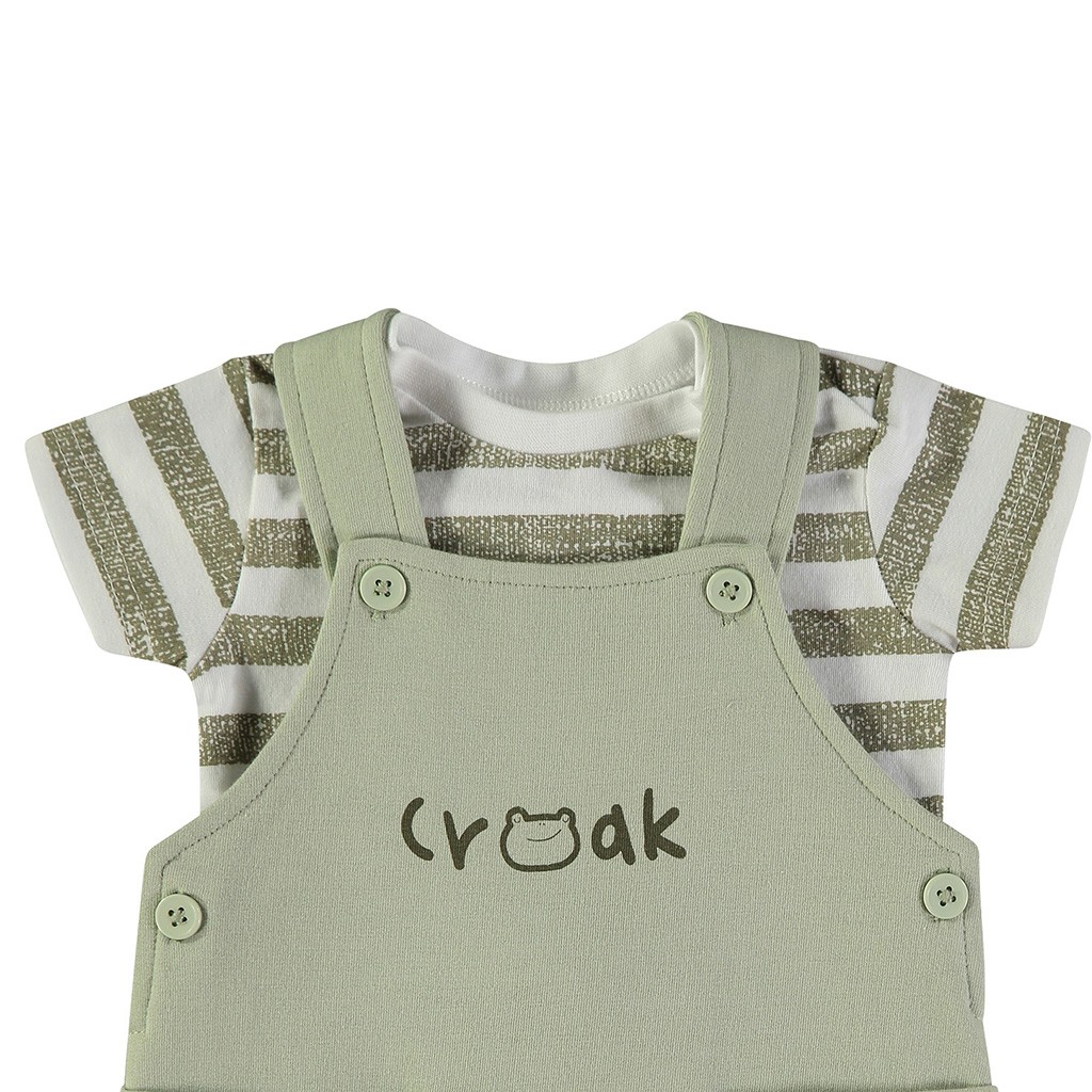 Conjunto de bebé confeccionado en tejido de algodón que combina camiseta de manga corta a rayas y peto en color liso con bolsillos frontales. De la marca Babybol.