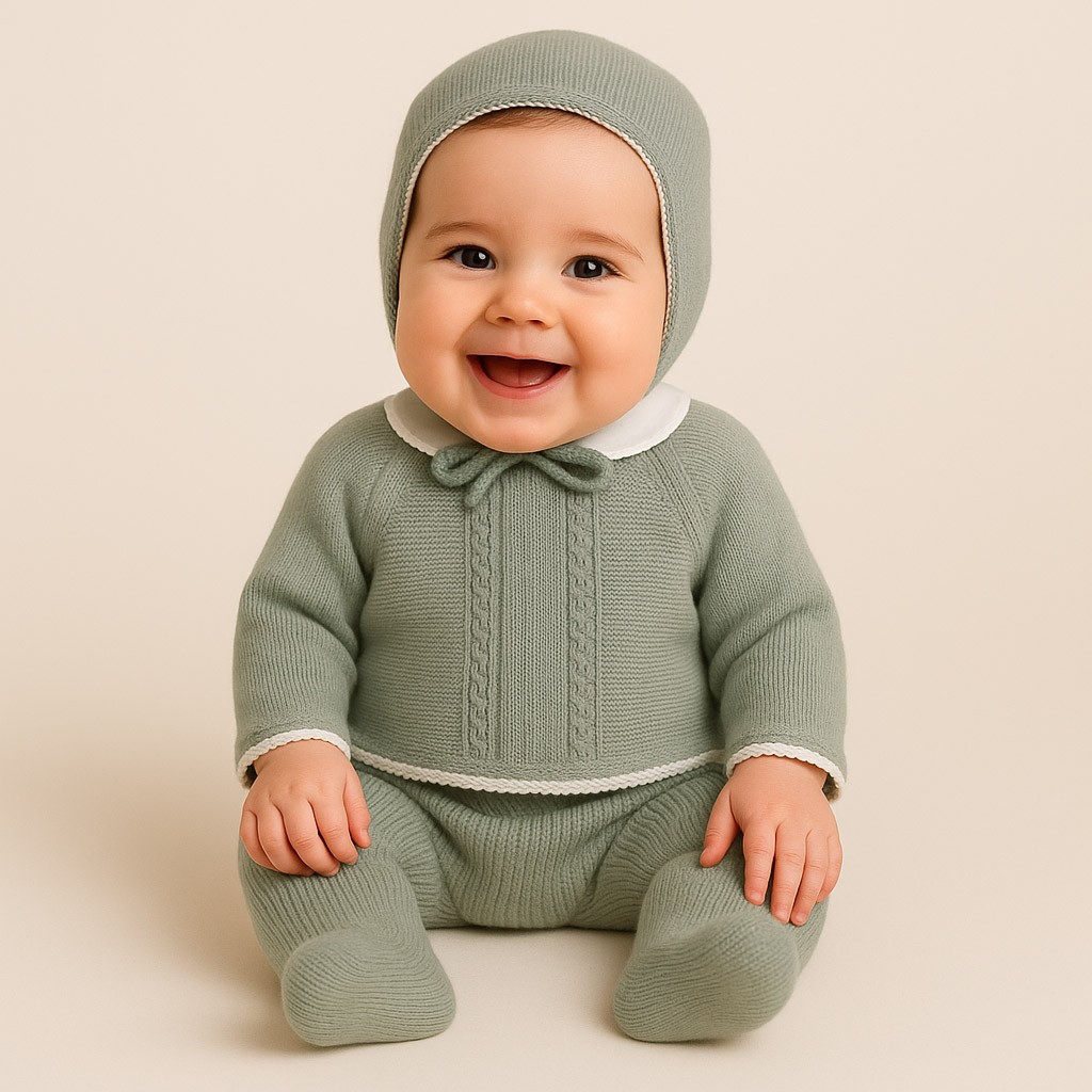 Conjunto de bebe de cálido y suave tejido acrilico con camiseta de manga larga con cuello bebe de pique y grecas en el pecho a juego con polaina. De envia en caja de regalo.