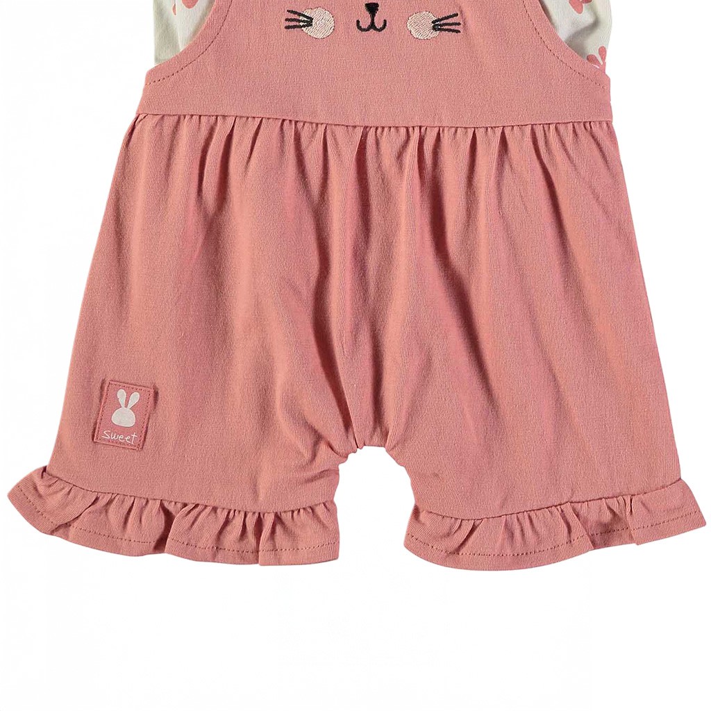 Conjunto de bebé compuesto por camiseta de manga corta estampada y peto en color rosa con volante en bajo, confeccionado en tejido de algodón. De la marca Babybol.