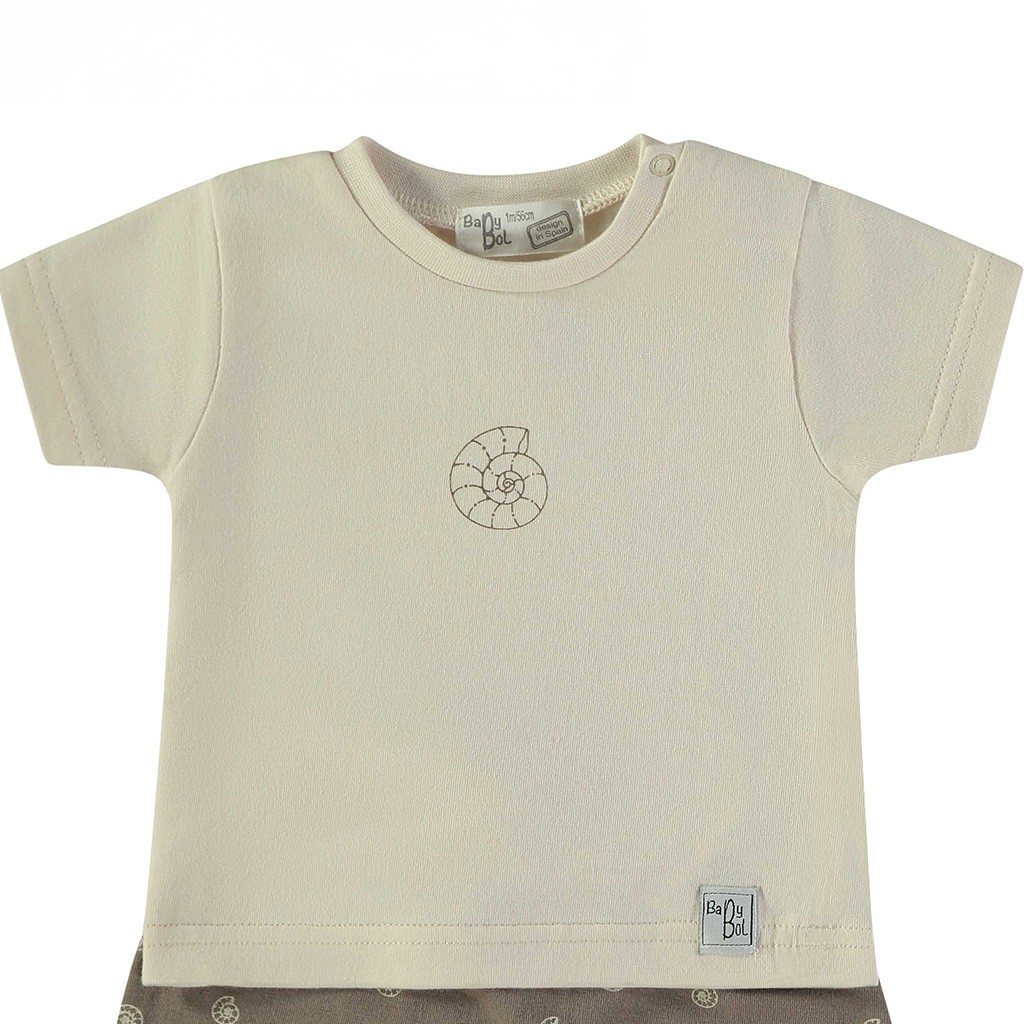 Conjunto de bebé con camiseta de manga corta con abertura en el cuello y pantaloncillo corto estampado en tejido de algodón. De la marca Babybol.