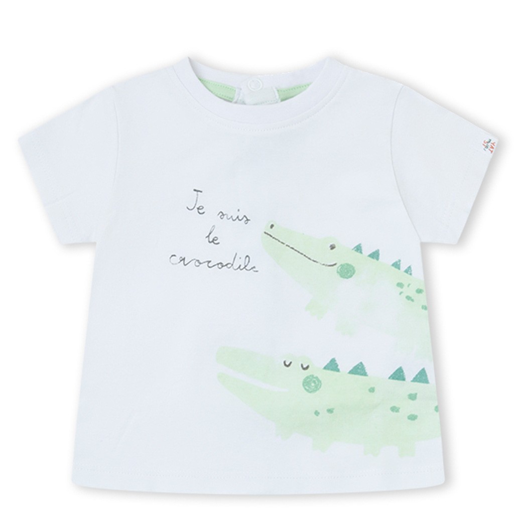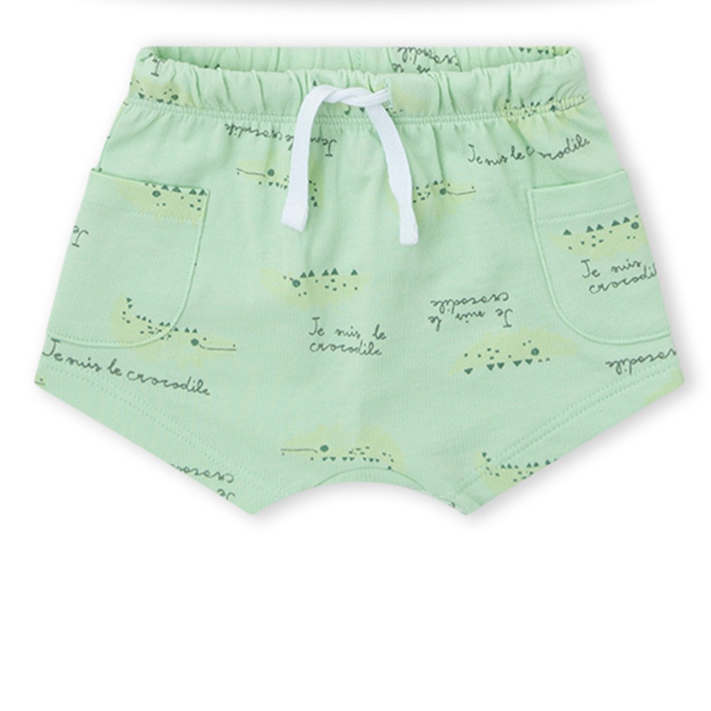 Conjunto de bebé de manga corta confeccionado en algodón con camiseta con dibujo delnatero de cocodrilos a juego con pantalón corto con cordón en cintura, de la marca Yatsi.