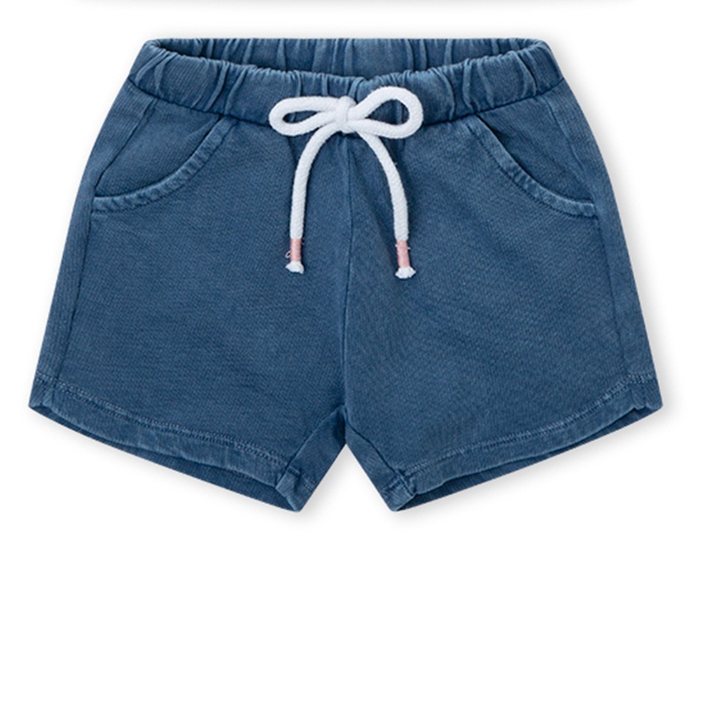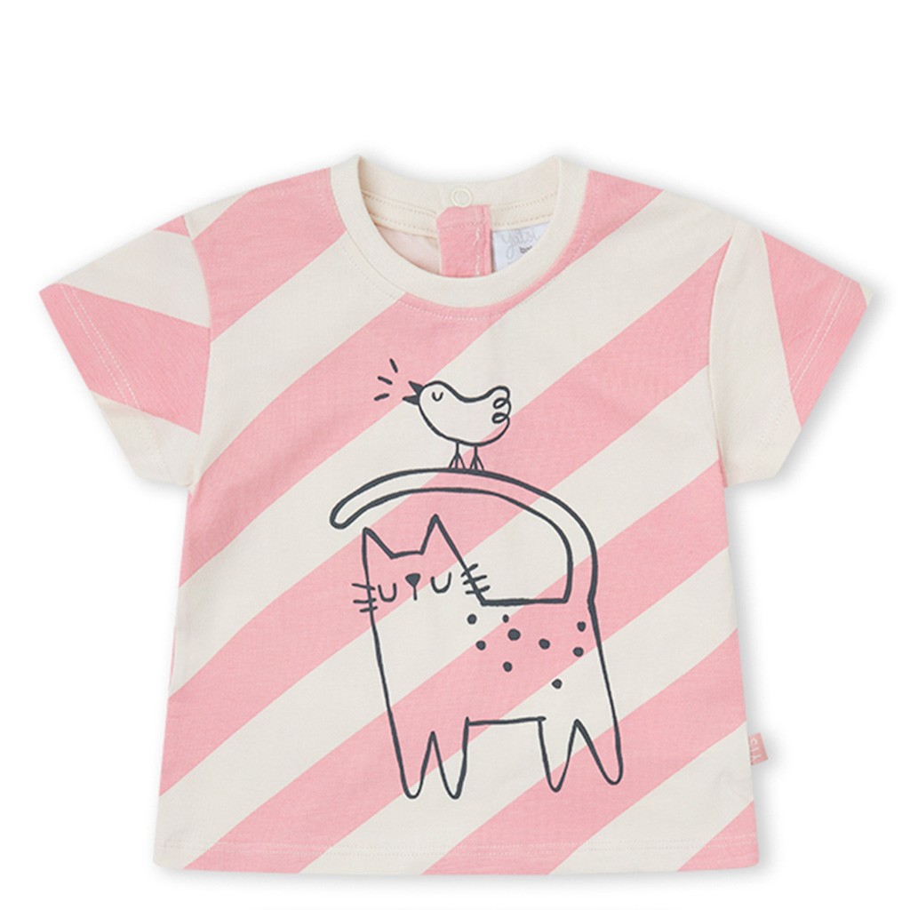 Conjunto para bebé de camiseta corta a rayas con dibujo y pantaloncito corto de algodón en color jeans con cordón en cintura y bolsillos. Marca Yatsi.
