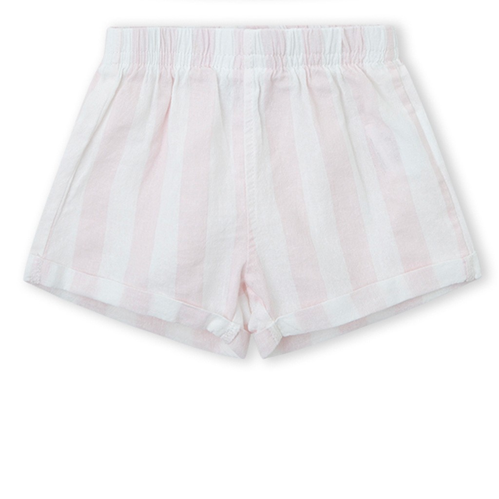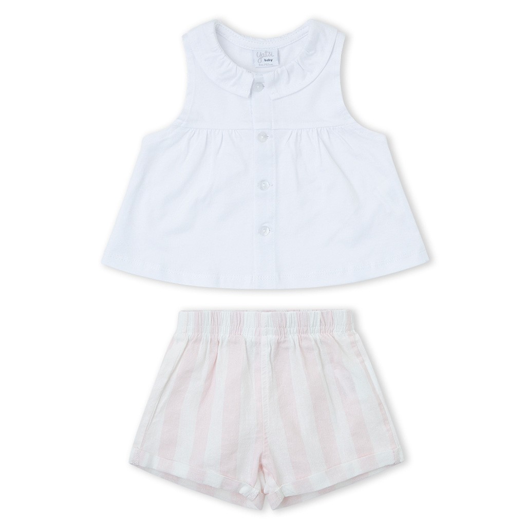 Conjunto de bebé de dospiezas confeccionado en tejido de algodón con camiseta sin mangas abierta por delante con botones y pantalón corto de rayas. De la marca Yatsi.