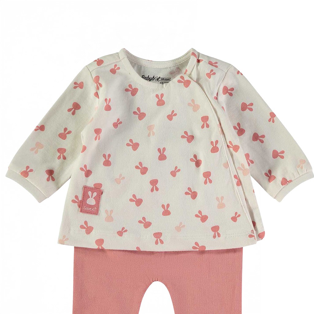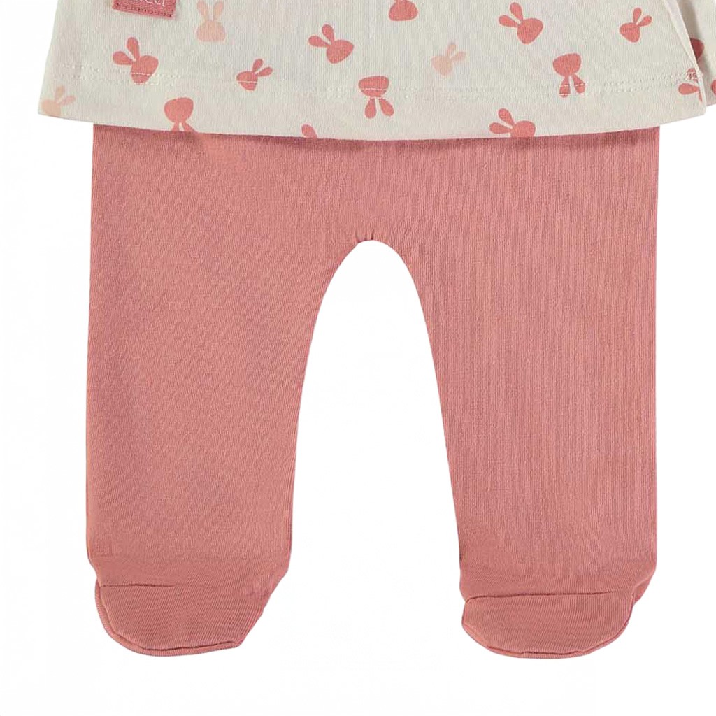 Conjunto para bebé en tejido de algodón que combina camiseta de manga larga con abertura lateral de corchetes estampada con conejitos y polaina en color a contraste. De la marca Babybol.