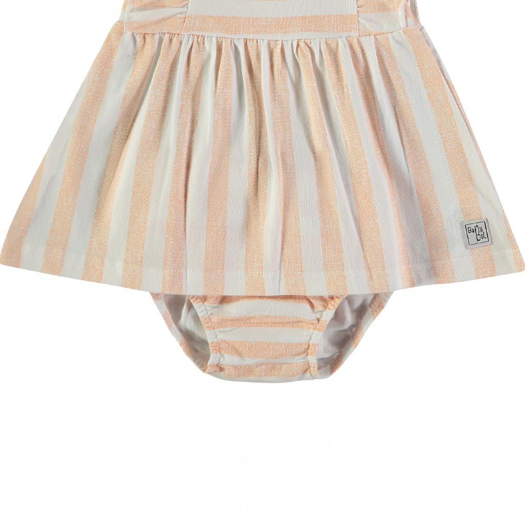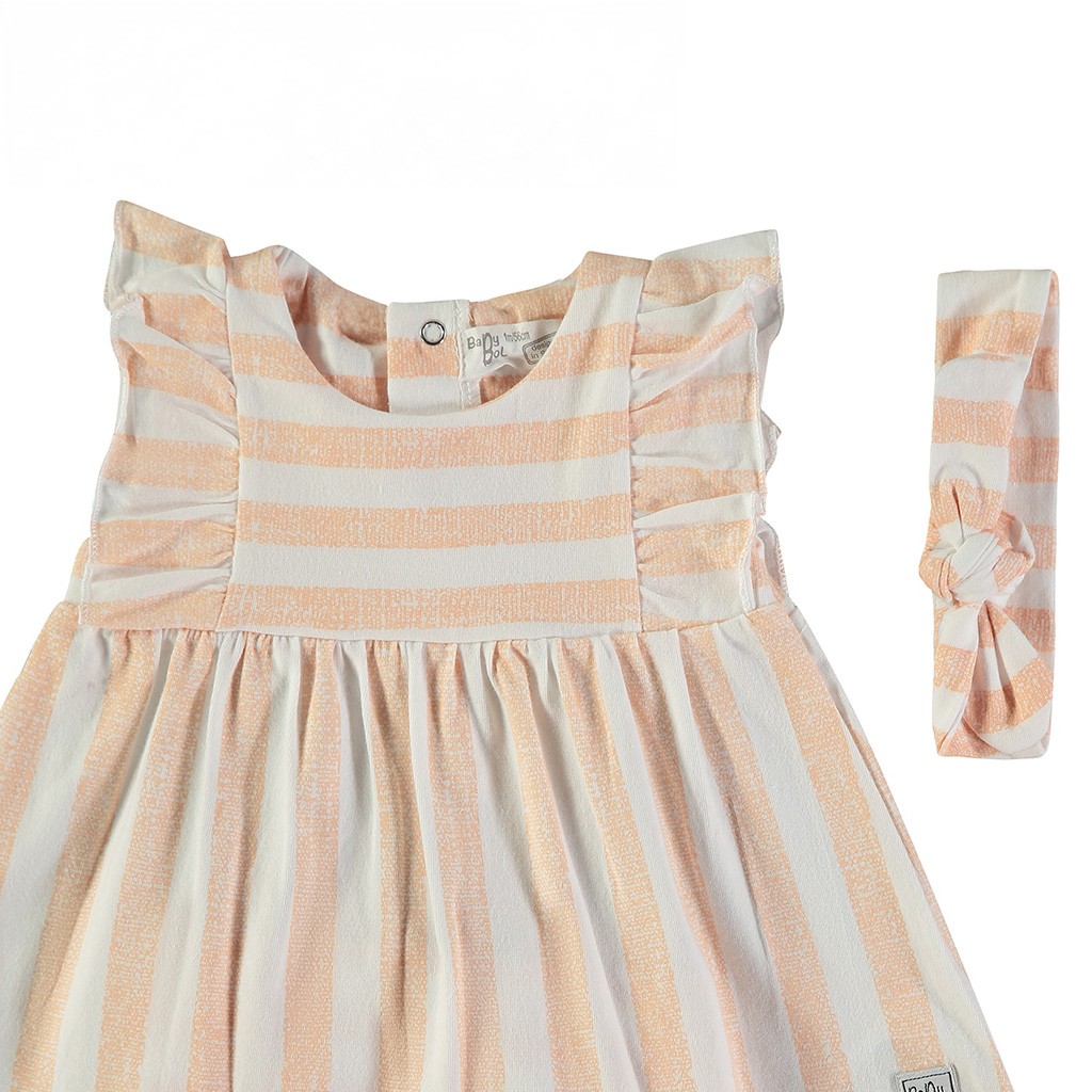 Vestido de bebé confeccionado en algodón a rayas con cierre en la espalda y a juego con diadema y braguita. De la marca Babybol.