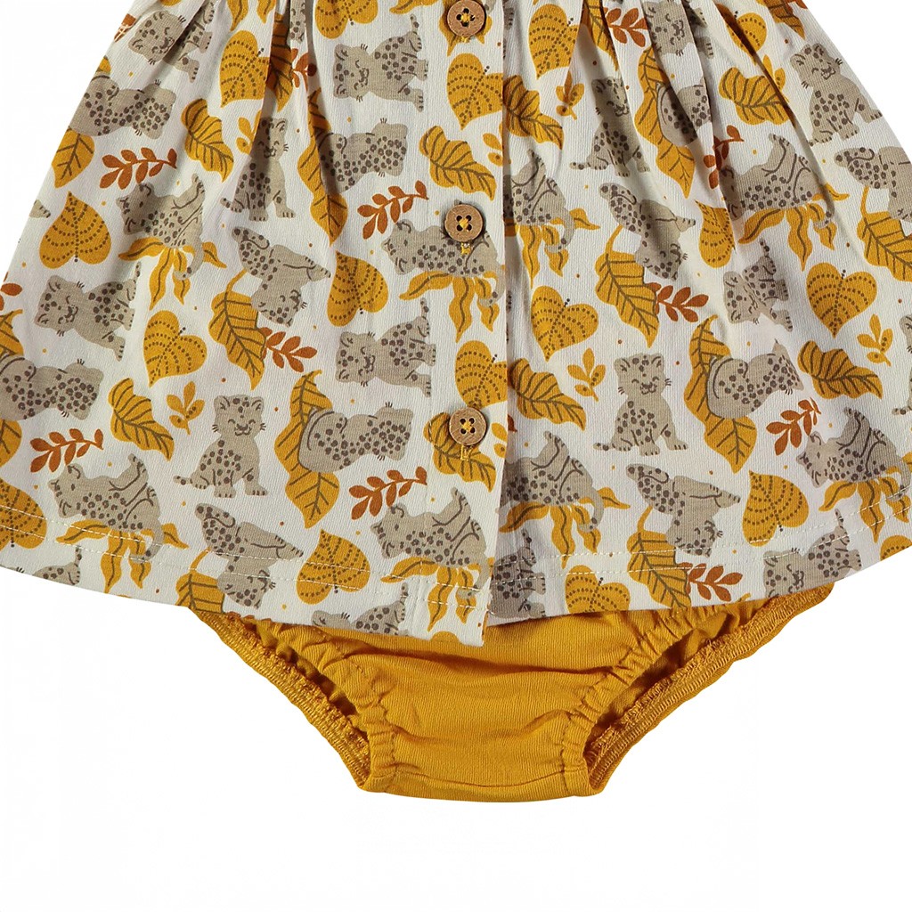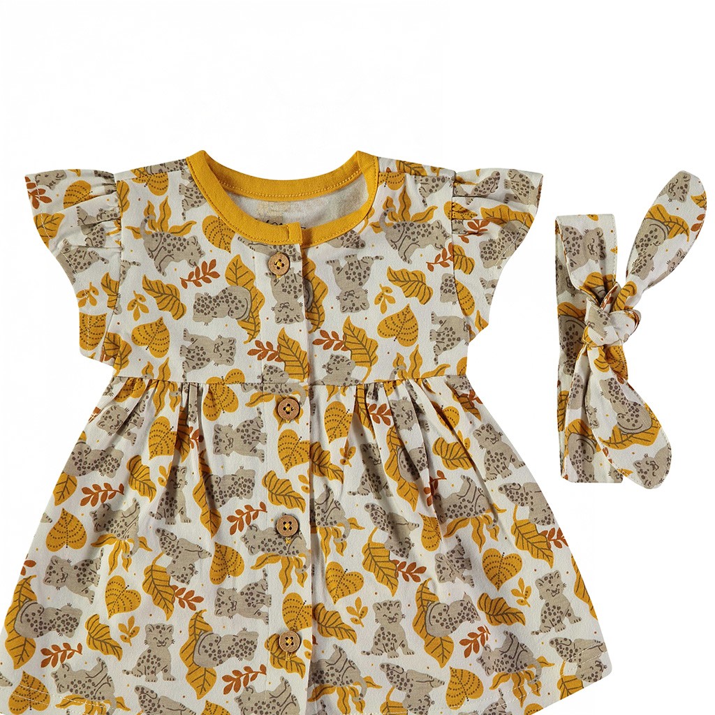 Vestido de bebé estampado confeccionado en tejido de algodón, mangas de volante y cierre de botones en la espalda, a juego con diadema y braguita de color liso a contraste. De la marca Babybol.