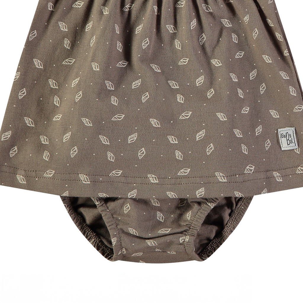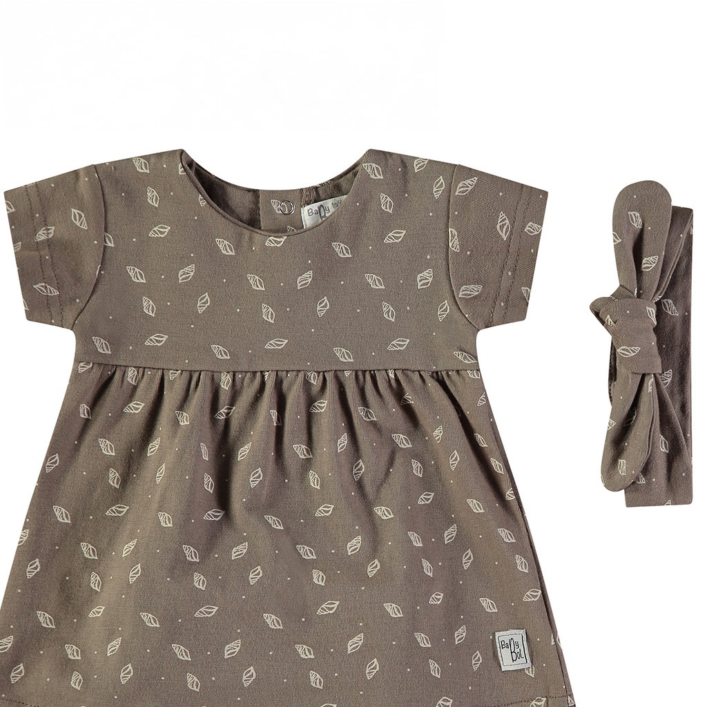 Vestido de bebé de manga corta, estampado y cierre de corchetes en la espalda, confeccionado en algodón con diadema y braguita a juego. De la marca Babybol.
