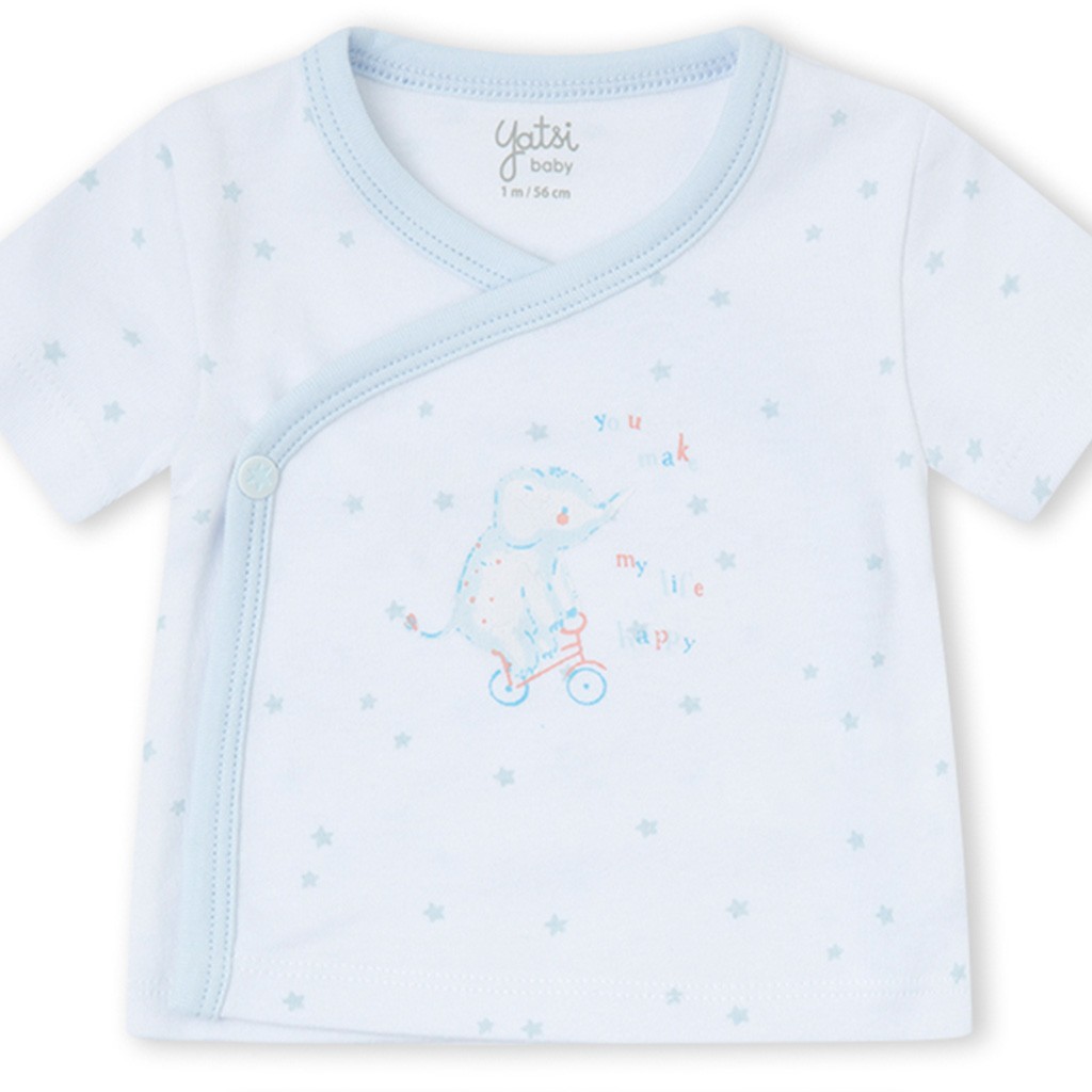 Conjunto para bebé recién nacido de manga corta y confeccionado en tejido de algodón que combina camiseta cruzada con dibujito en el pecho y cubrepañal estampado. De la marca Yatsi. Se envía en caja.
