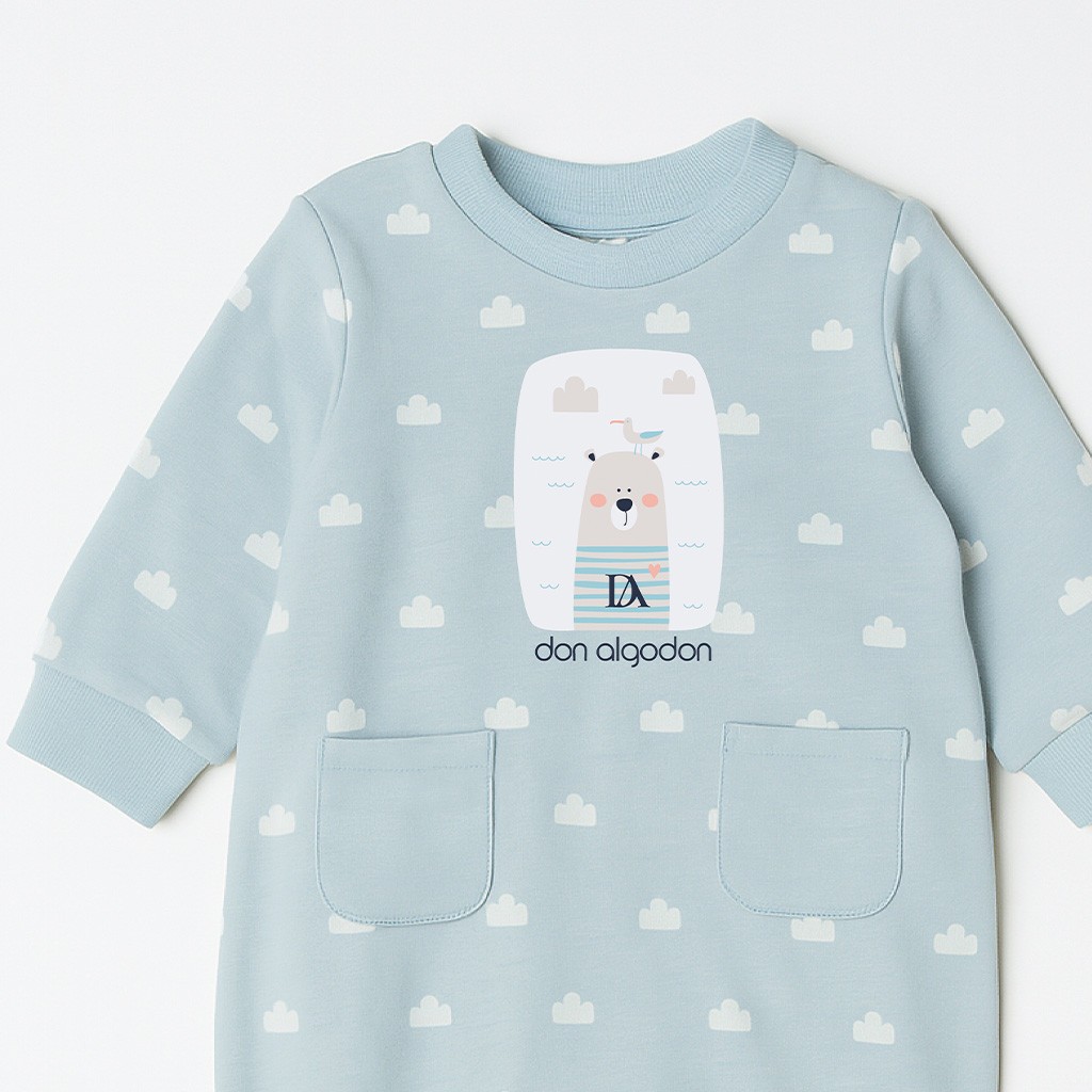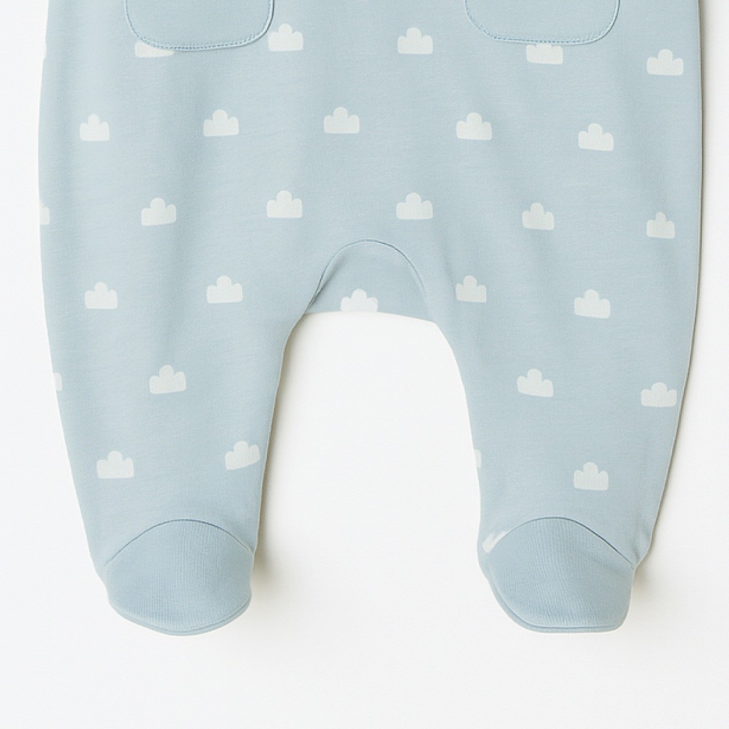 Pelele para bebé de tejido de algodón estampado con nubes y detalle de bolsillos frontales. Se envía en cajita.