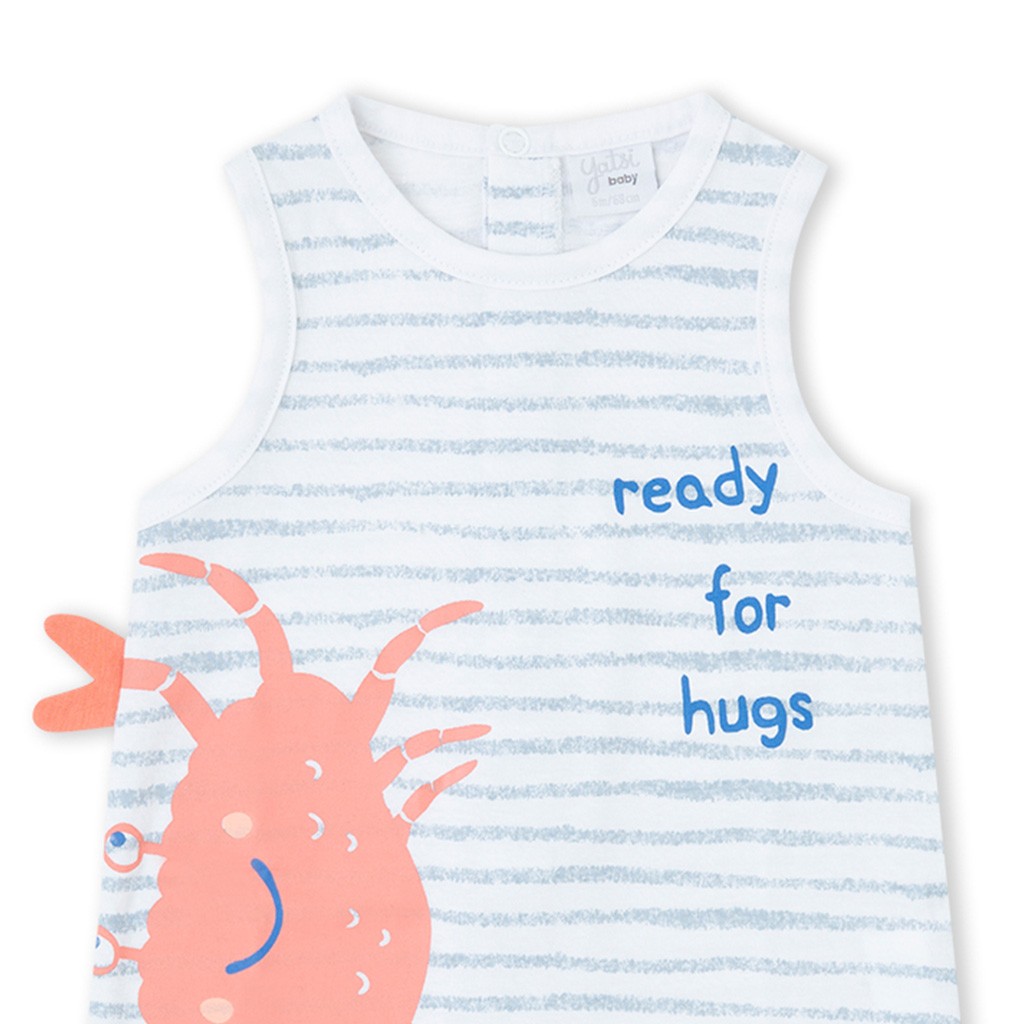 Pelele para bebé de algodón con dibujo delantero sobre fondo de rayas, de tirantes y con cierre de corchetes por detrás. Presentación en caja. De la marca Yatsi.