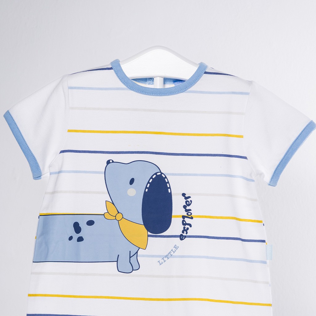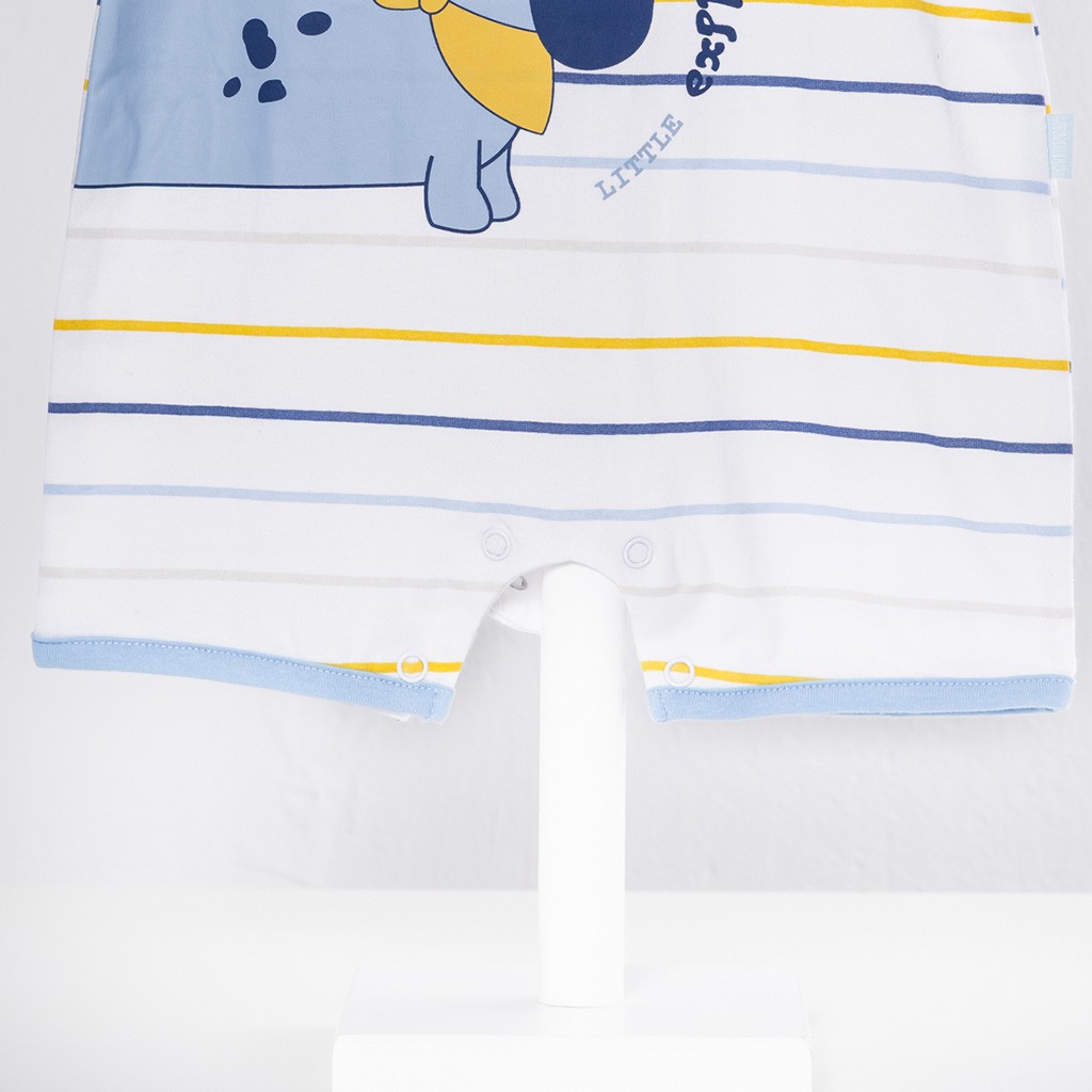 Pelele de bebé de manga corta confeccionado en algodón con dibujo delantero sobre fondo de rayas, abierto en la espalda con corchetes. Presentación en caja.