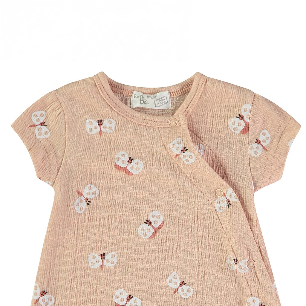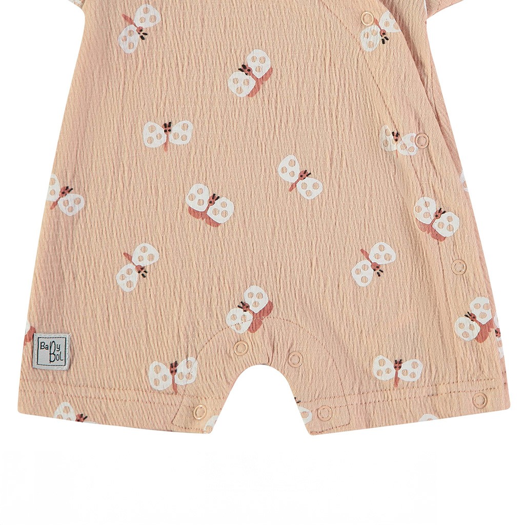 Pelele corto de bebé en tejido de algodón con estampado de mariposas, abierto en el lateral con corchetes, De la marca Babybol.