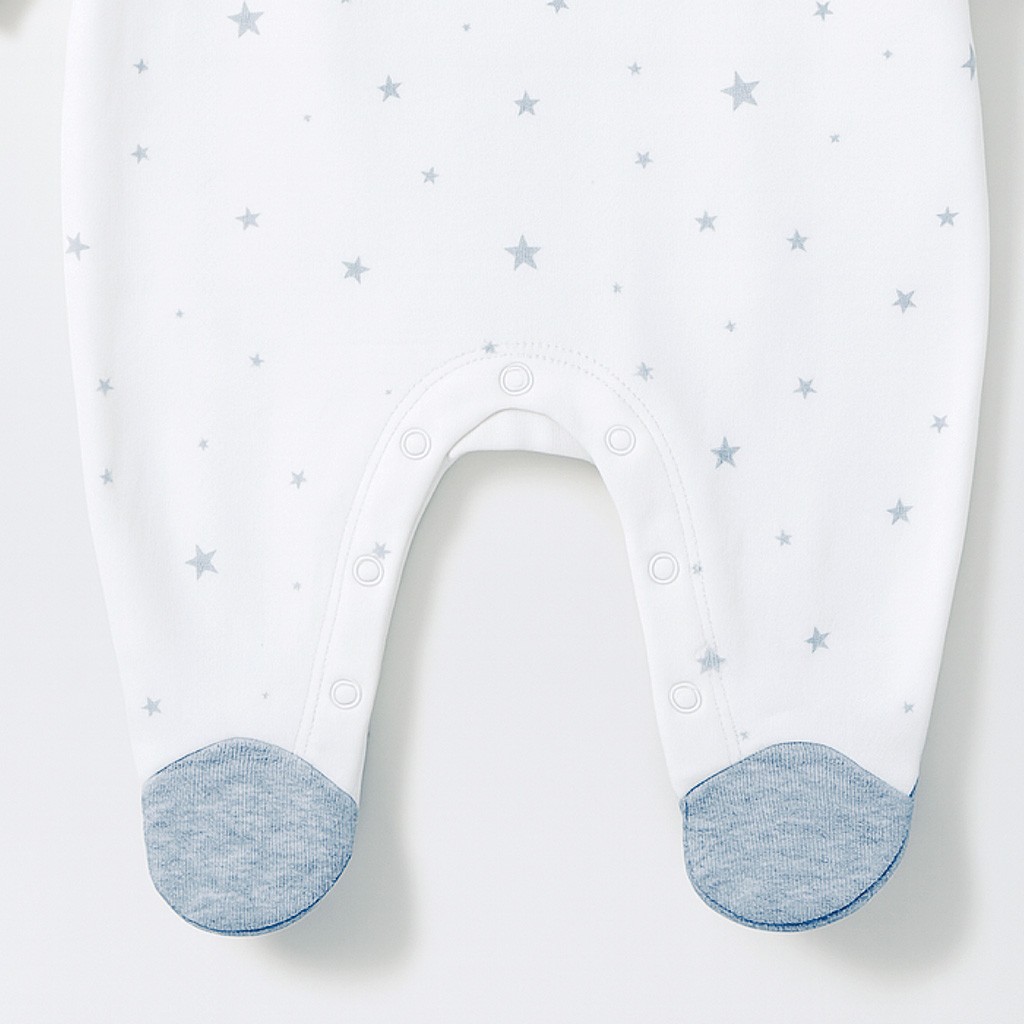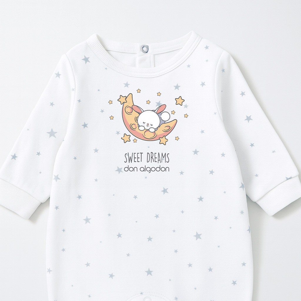 Pelele para bebé de manga larga en tejido de algodón estampado, con cierre en la espalda de botones automáticos. Presentado en caja.