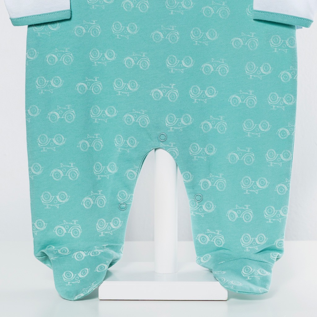 Pijama de bebé de cuerpo entero y manga larga confeccionado en tejido de algodón con estampado delantero de cochecito y cierre de corchetes en la espalda. Presentado en caja.