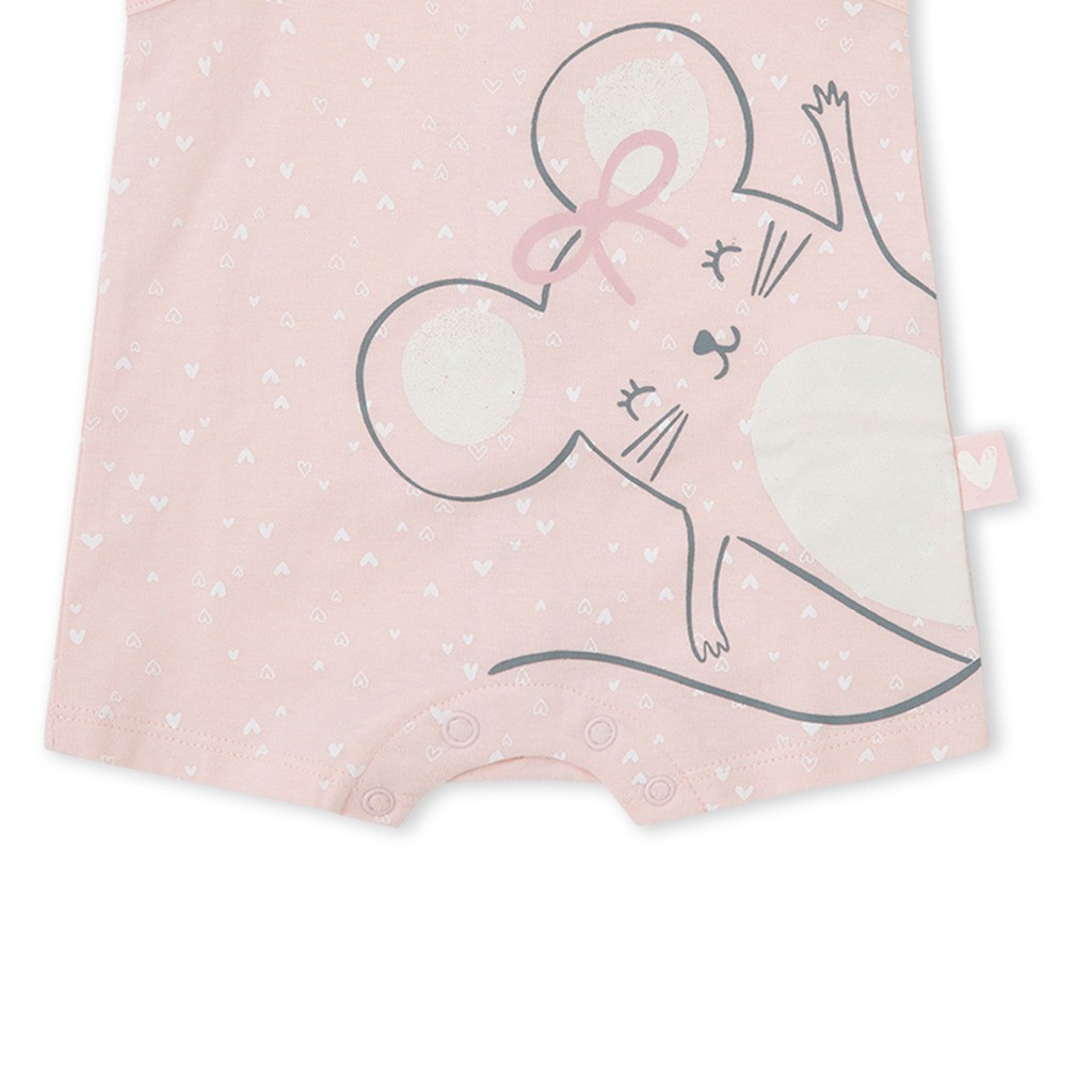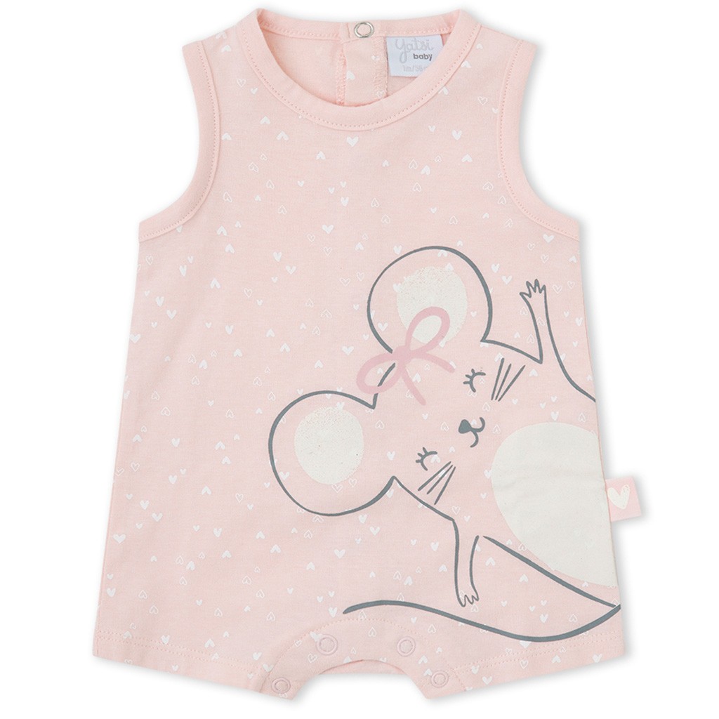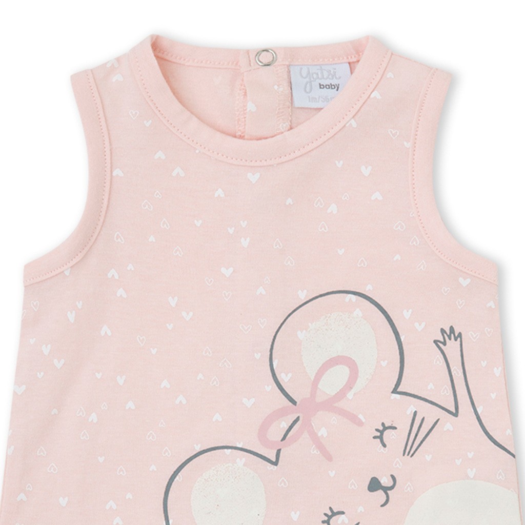Pelele de bebé de la marca Yatsi, cofeccionado en tejido de algodón estampado con corazoncitos y dibujo delatero, con cierre de corchetes en la espalda. Se envía en caja.