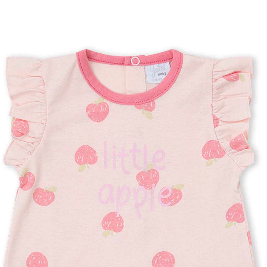 Pelele para bebé en tejido de algodón con estampado de manzanas con volantes en la mangas y con cierre en la espalda de corchetes. Se envía en caja. De la marca Yatsi.
