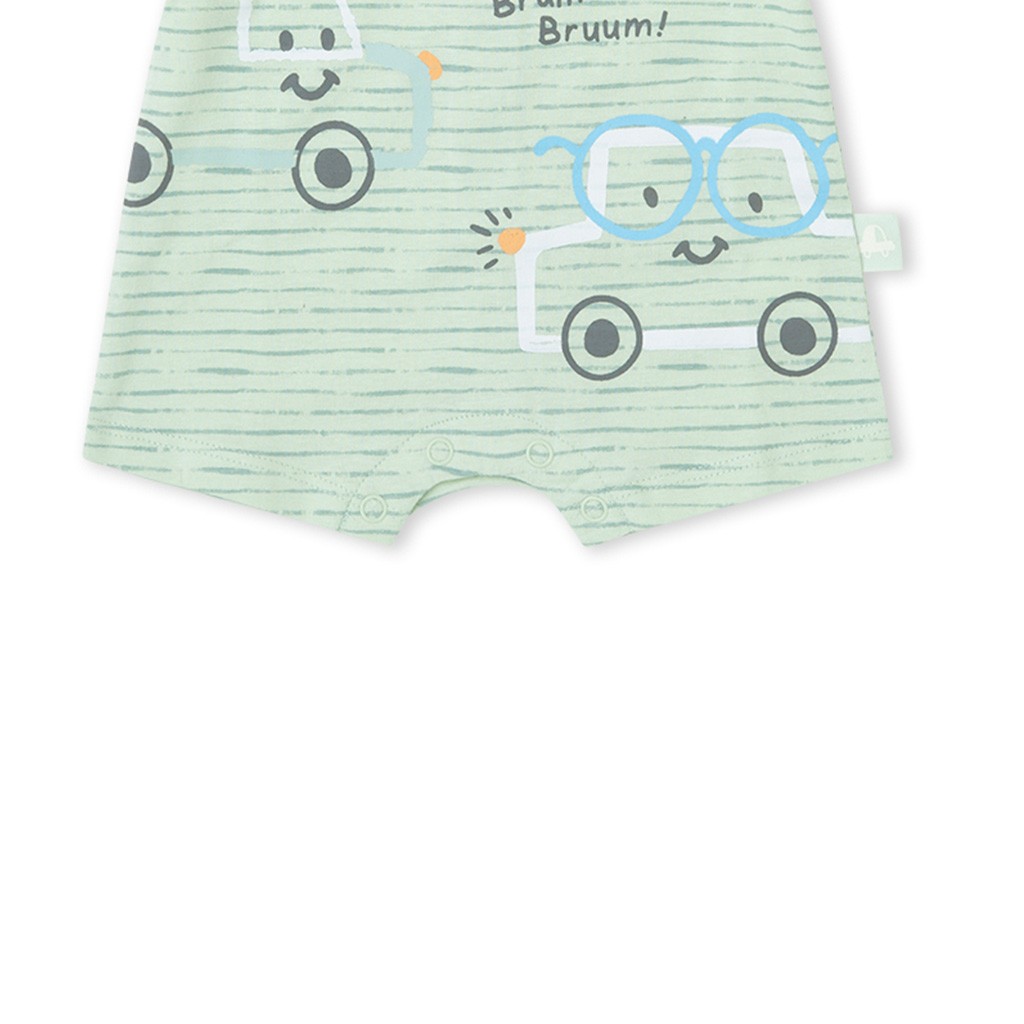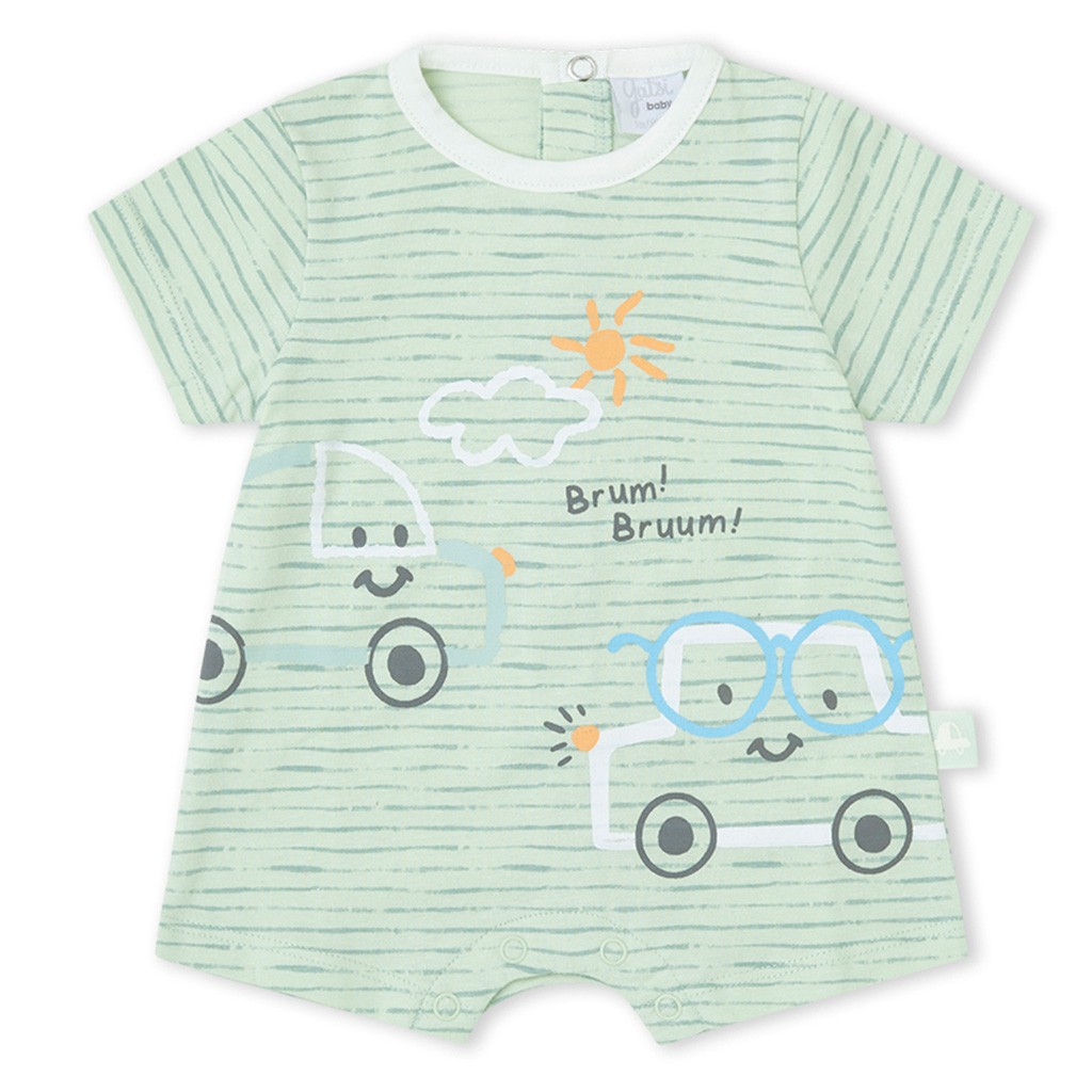 Pelele para bebé de manga corta con cierre de corchetes en la espalda, a rayas con dibujo delantero. Presentación en caja. De la marca Yatsi.