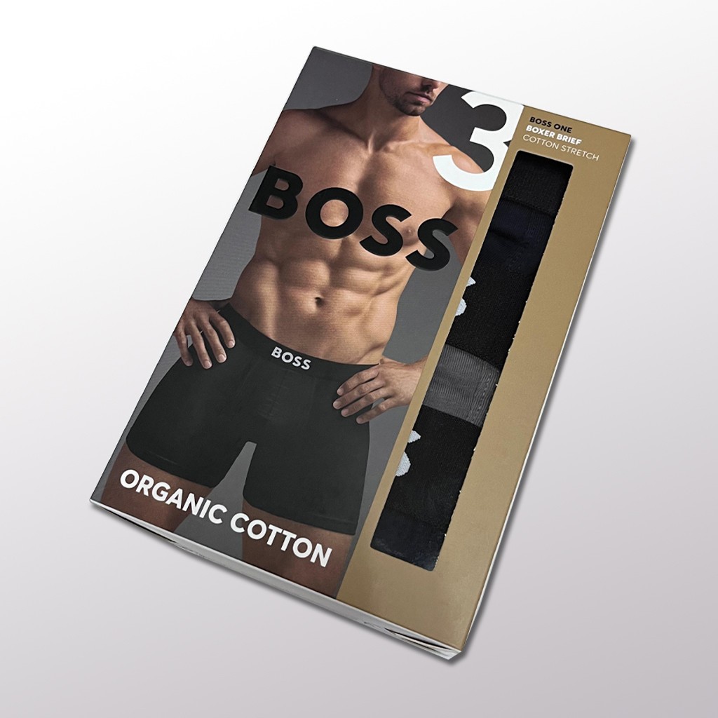 Pack de 3 bóxer para hombre de algodón suave y elástico con cintura de goma vista y patrón clasico un poquito mas largo. Linea One de Boss. Se envia en blister de carton con ventana y foto.