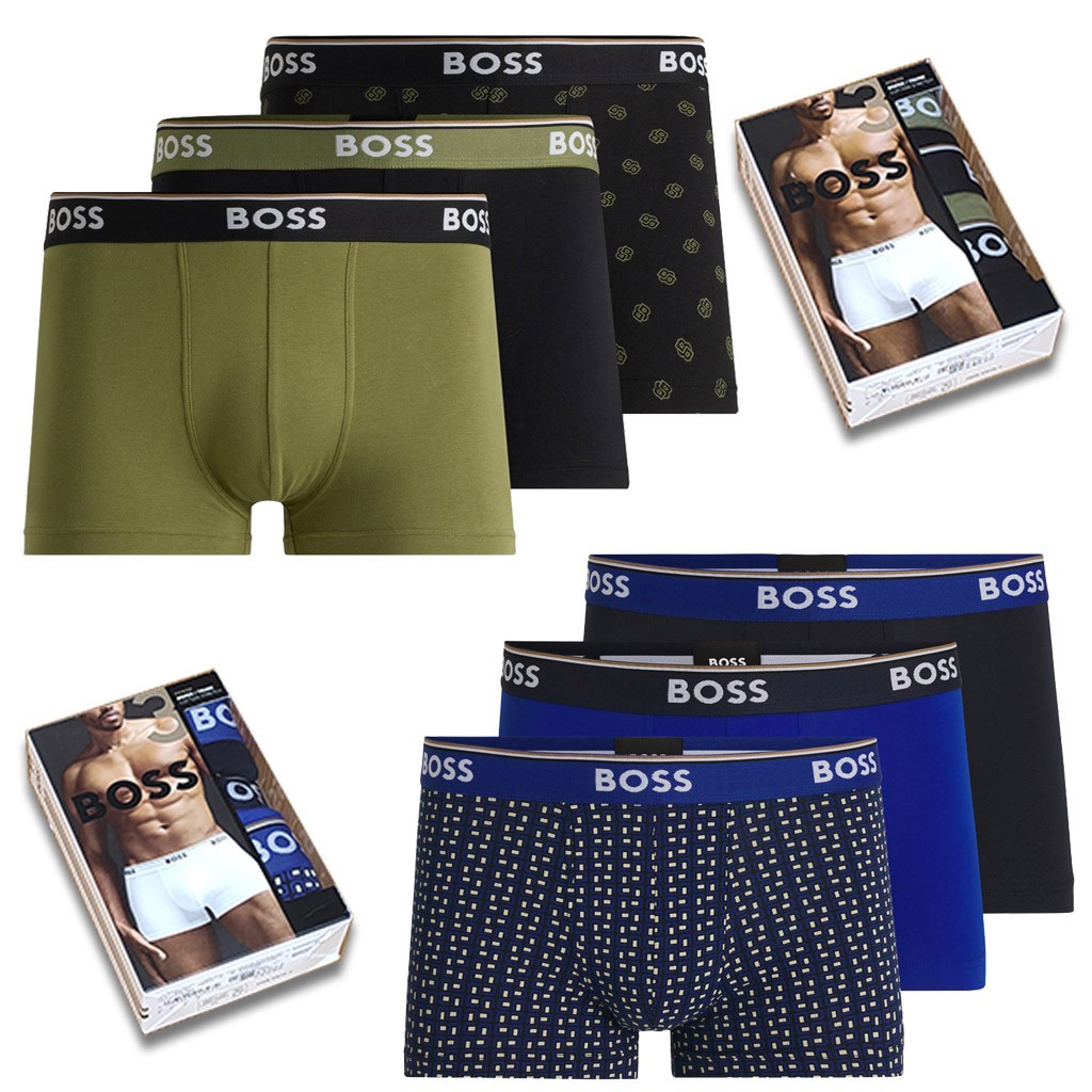 Pack de 3 bóxer BOSS confeccionados en Algodón elástico con cintura de goma vista con logo. Cada pack se compone de 2 boxer lisos y uno estampado con diferentes detalles. Disponibles dos surtidos en combinacion de verde negro o azules.