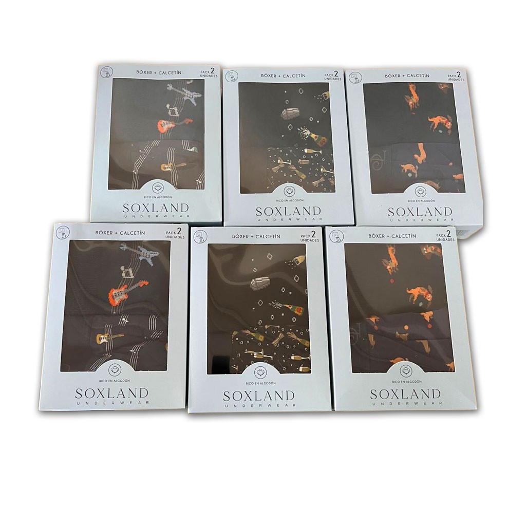 Lote de regalo con un bóxer para hombre estampado con divertidos diseños mas un calcetin a juego. Se envia en una cajita de regalo con ventana. Cada caja de 6 estuches contiene 3 dibujos.