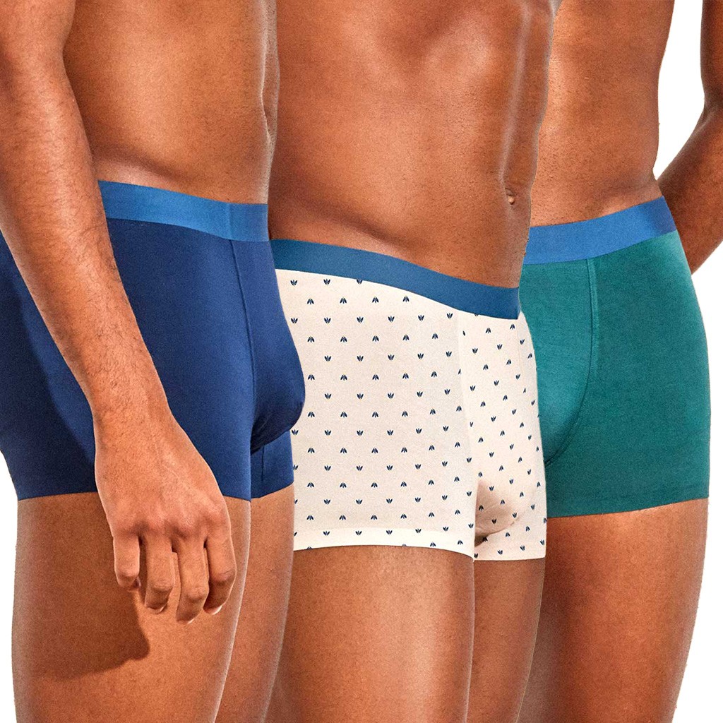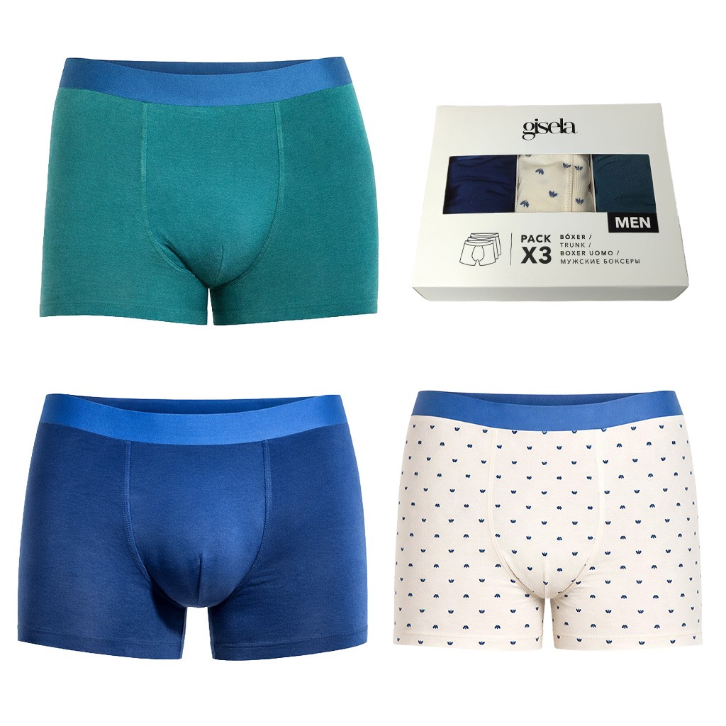 Boxer de hombre de goma vista confeccionado en tejido modal, en estuche de 3 unidades que combina dos diseños lisos y uno estampado.