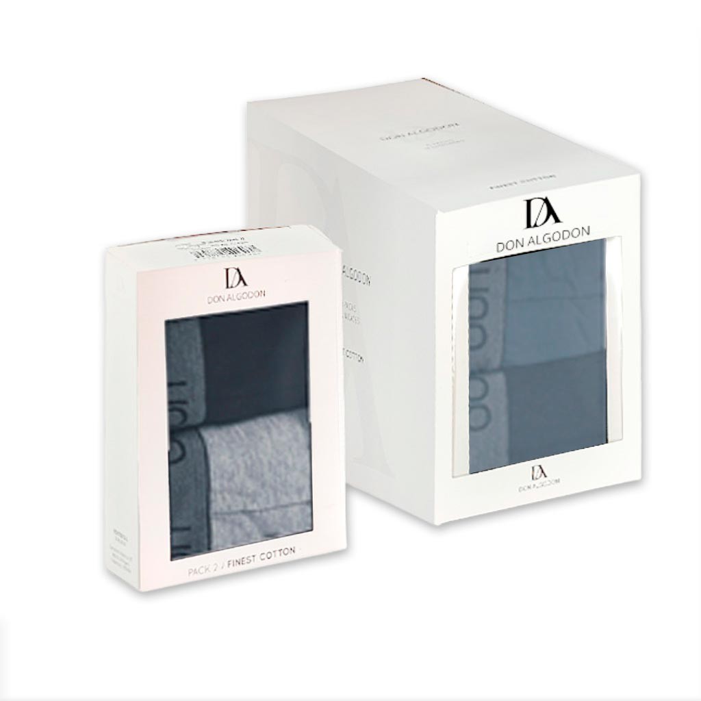 Boxer de algodón para hombre con cintura de goma vista en estuche de dos unidades combinadas, un modelo liso y otro estampado.