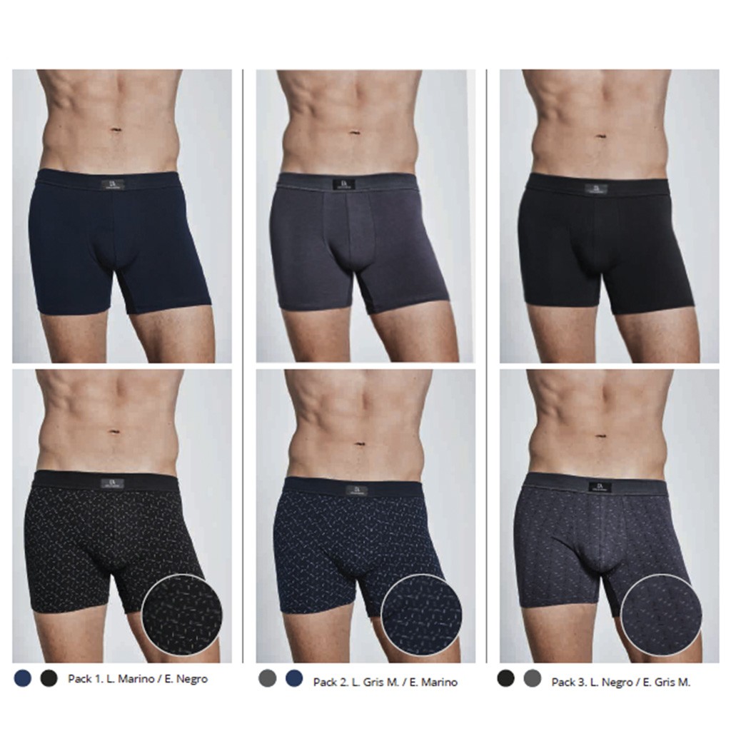 Pack de 2 bóxer de suave y elástico algodón elastano con cintura de goma recubierta en canale 1 x 1 supercómoda. Combinacion de 1 bóxer liso y otro estampado en cada pack. Caja surtida de 6 pack con 3 combinaciones de color. Nuevo diseño de Logo DA.