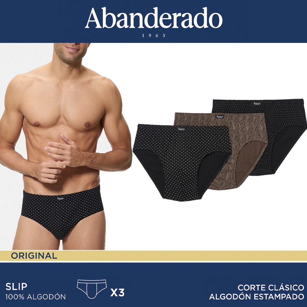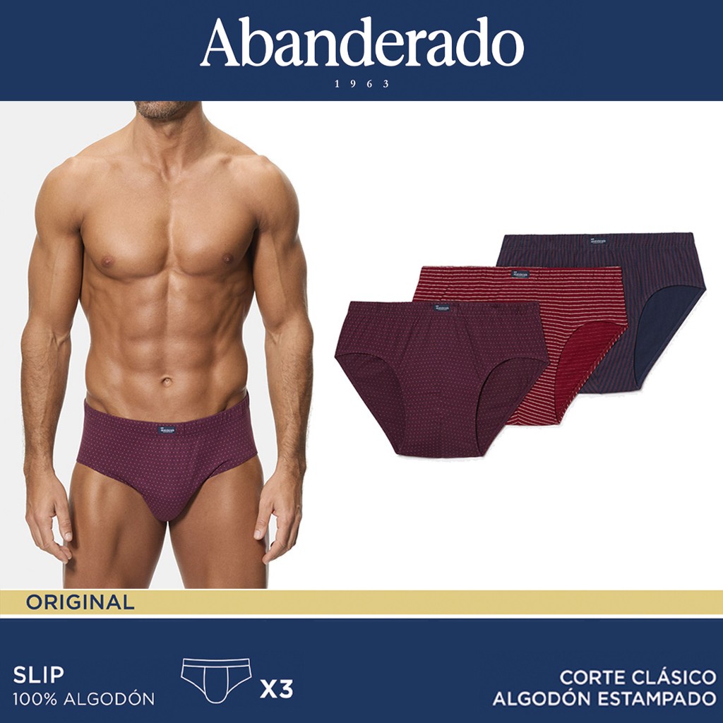 Pack 3 slips cerrado para hombre de Abanderado. Confeccionado en Algodón estampado, con cintura de goma recubierta y patrón alto. Se envia en cajas surtidas de 4 pack según disponibilidad de colores.