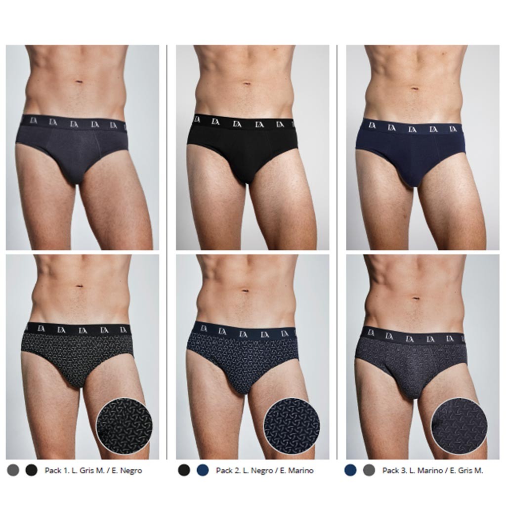 Pack de 2 slip con cintura de goma vista suave y cómoda con logotipo Don Algodón. Confeccionados en algodón y elastano muy adaptables. Cajas de 6 pack 2 combinando 1 slip estampado con logo DA con otro liso.