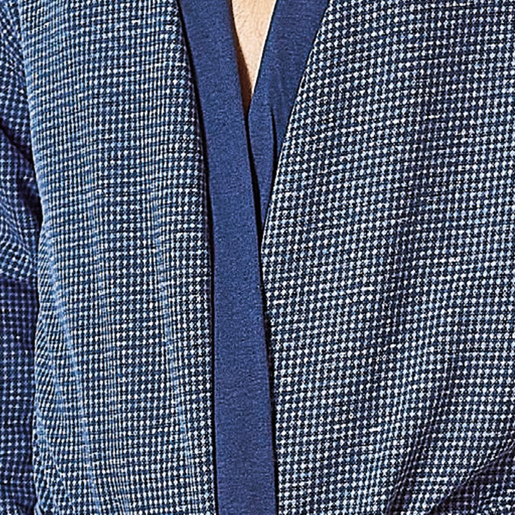 Batín largo de hombre en tejido de algoón estampado, cruzado con cinturón y con bolsillos laterales. Se presenta en caja.