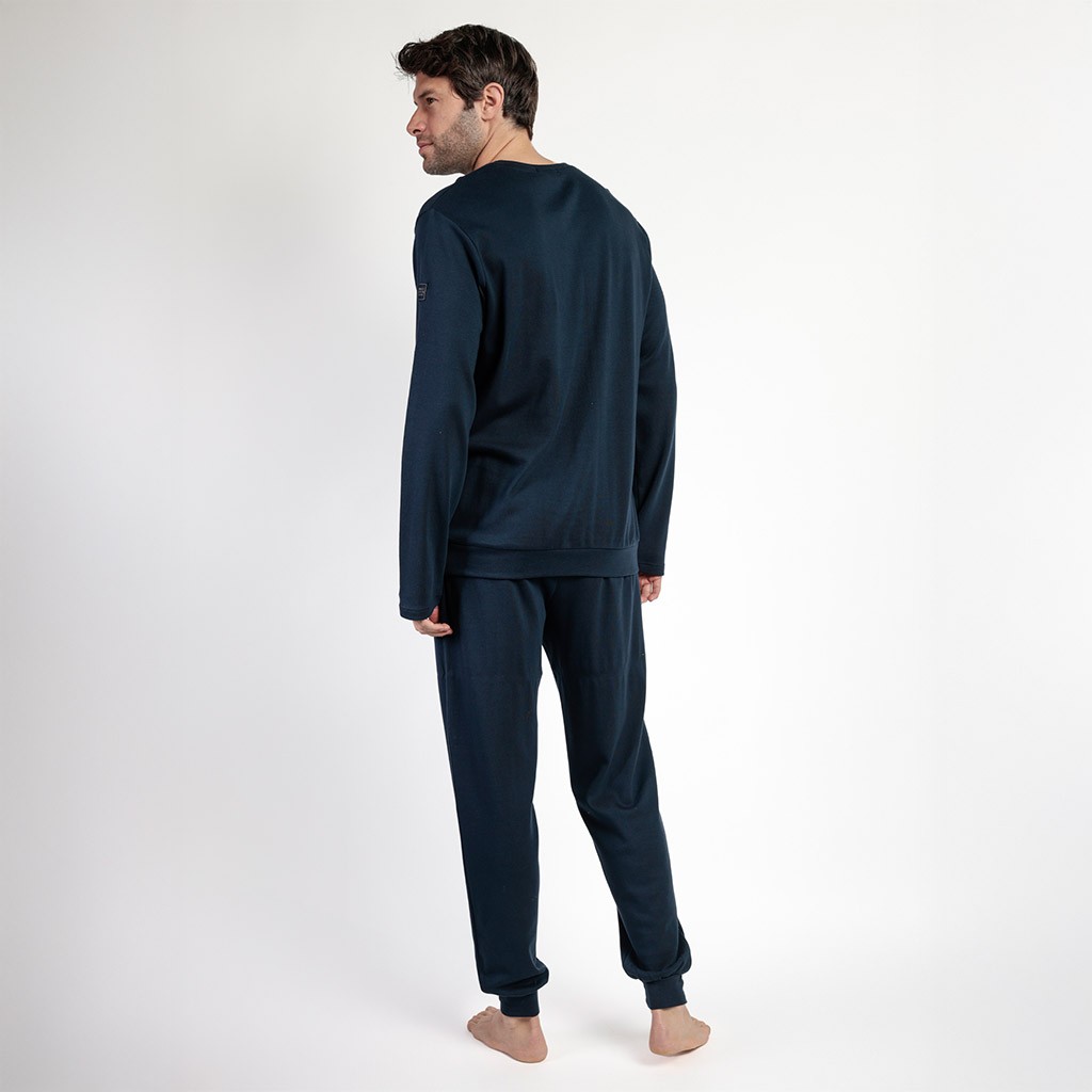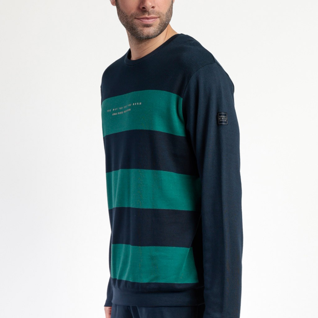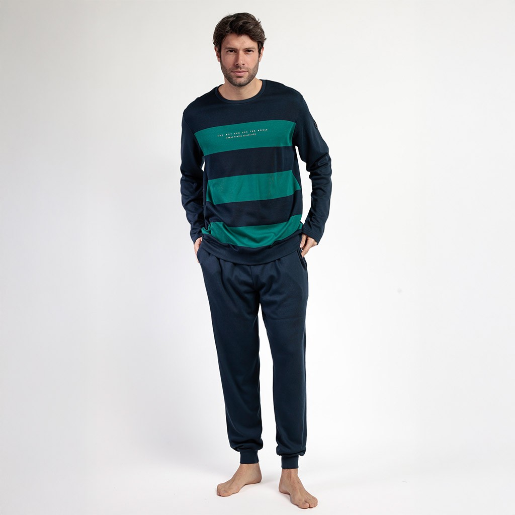 Pijama de hombre compuesto de camiseta de manga larga con franjas y pantalón en color a juego con bolsillos y puños elásticos. Marca Admas. Presentación en caja.