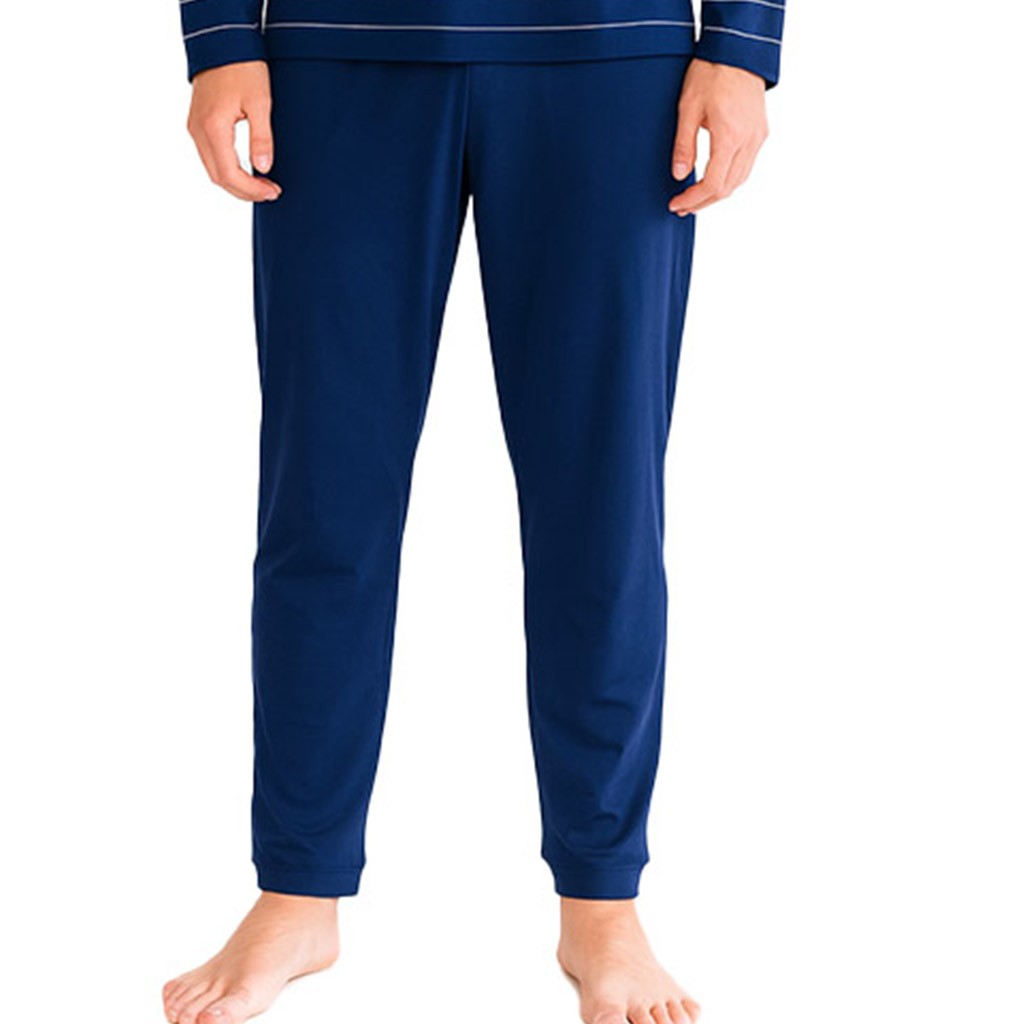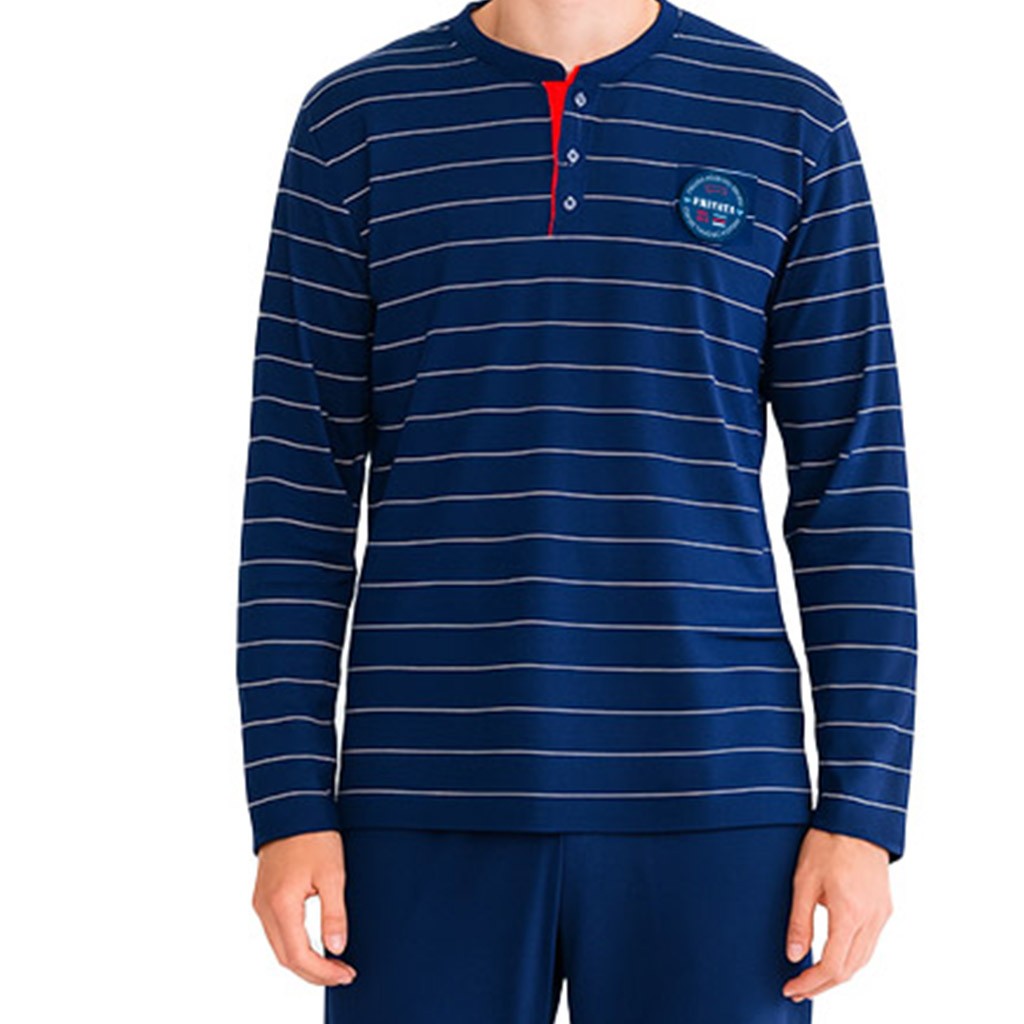 Pijama de hombre en tejido de algodón que combina camiseta de rayas con cuello de botones y pantalón de color liso con puños.