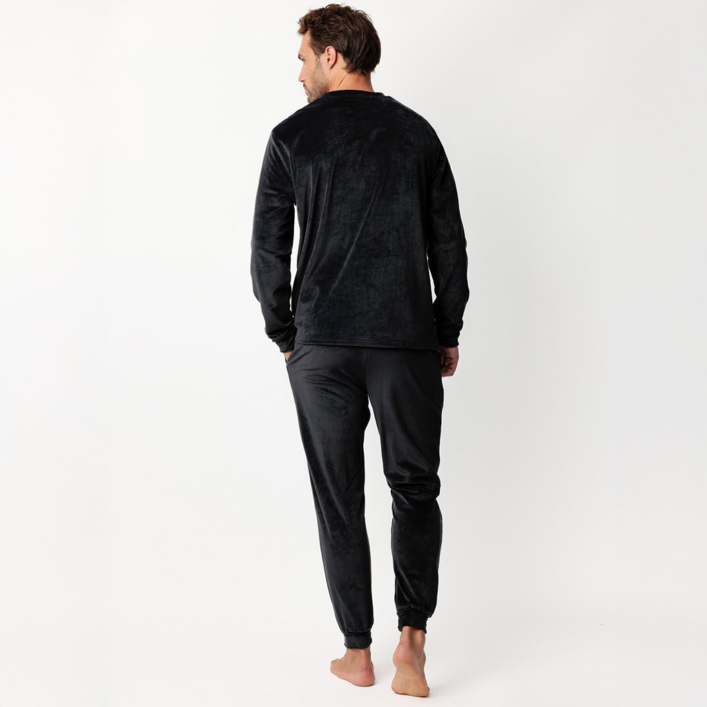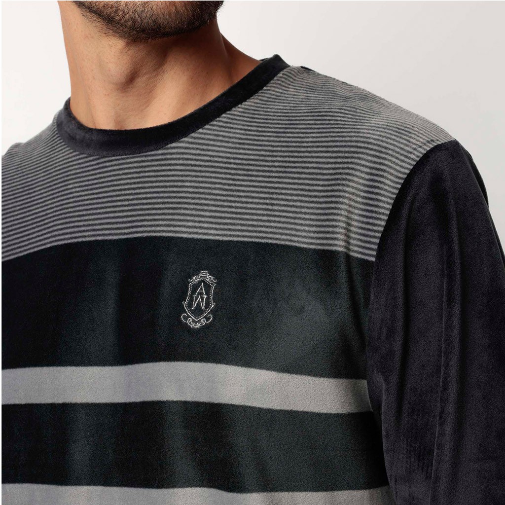 Pijama de manga larga para hombre en tejido aterciopelado que combina camiseta de rayas y cuello redondo con pantalón largo con puños y bolsillos. De la marca Admas. Presentado en caja.