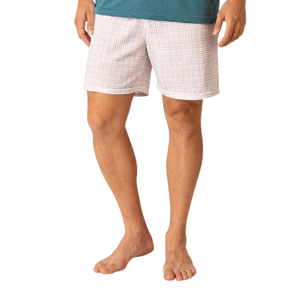 Pijama de manga corta para hombre confeccionado en algodón, que combina camiseta con cuello de botones con bolsillo en el pecho y pantalón corto de cuadritos. Se envía en caja.