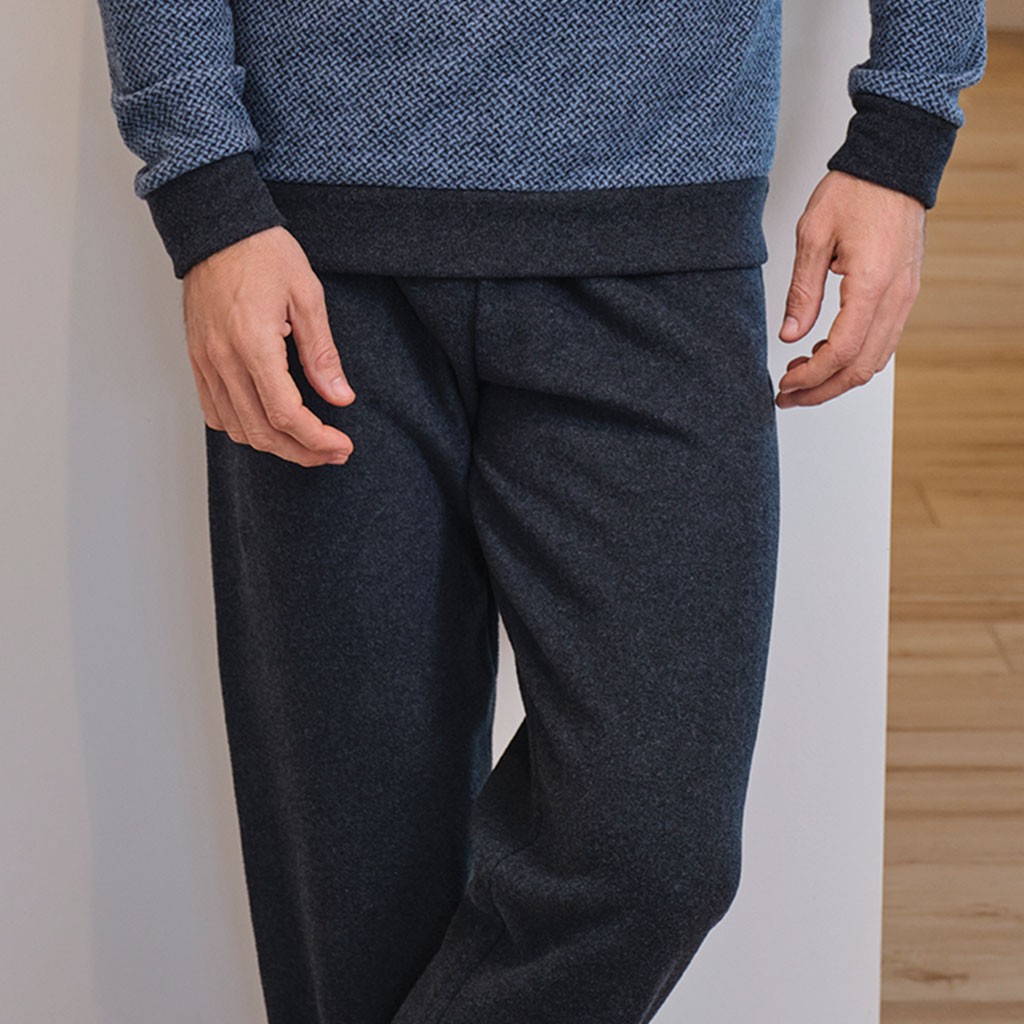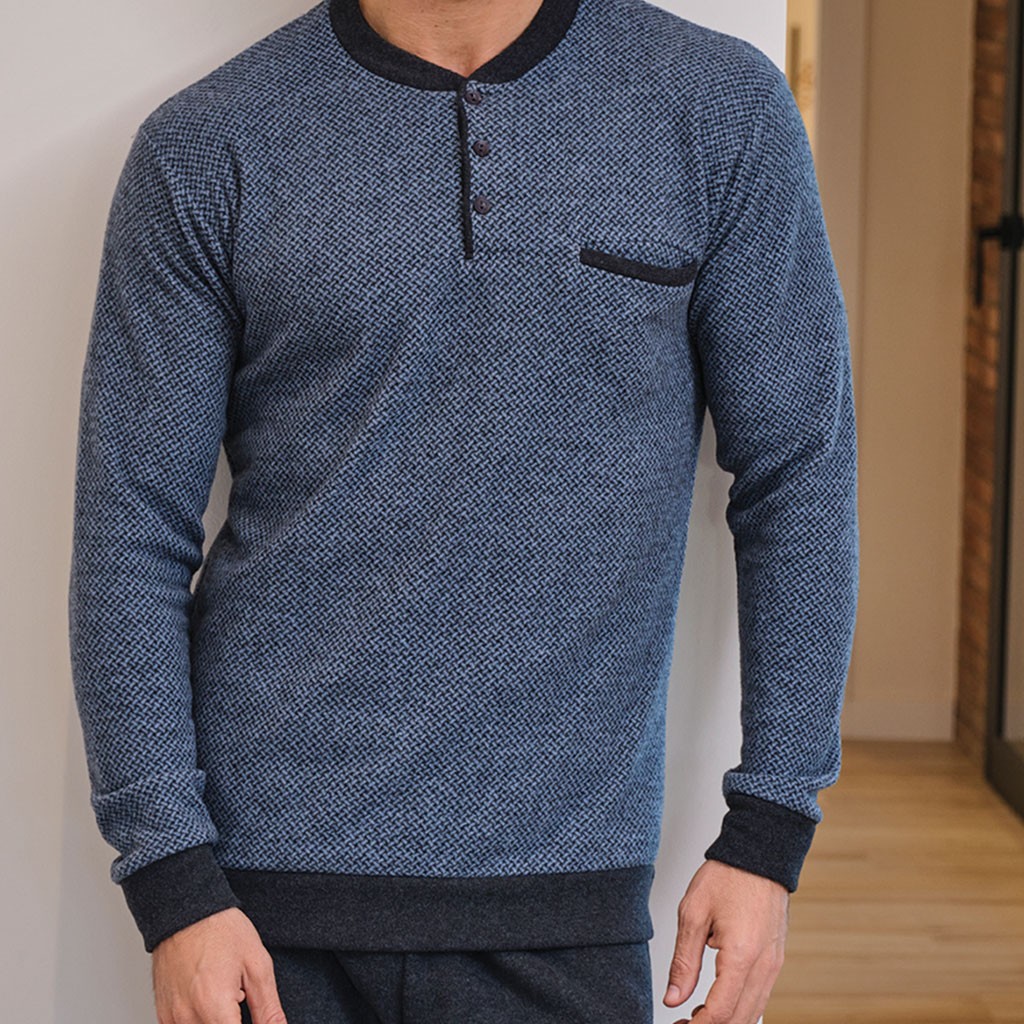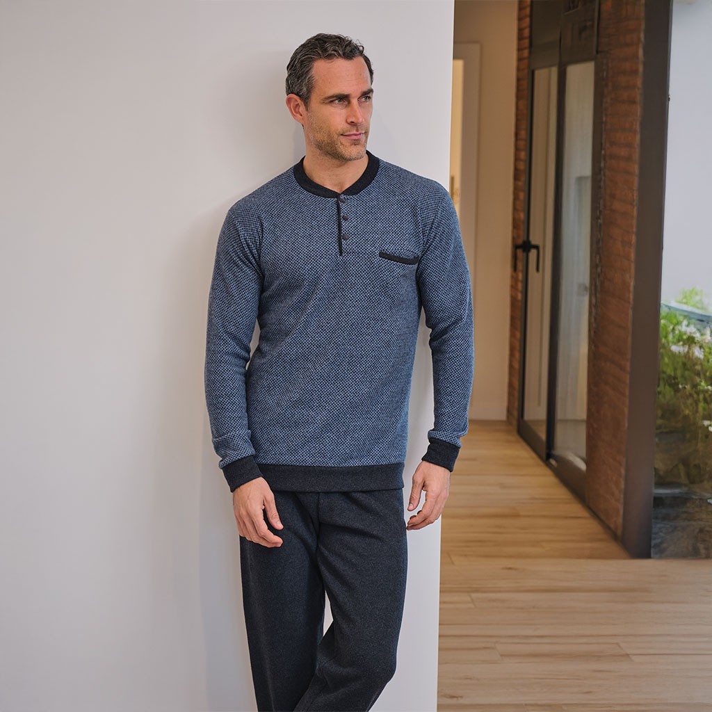 Pijama de hombre confeccionado en tejido afelpado de la marca Muslher que combina camiseta de manga larga con cuello de botones y fino estampado con pantalón largo en color liso a contraste.