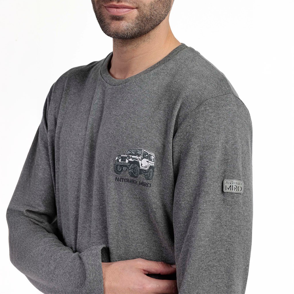 Pijama largo de hombre en color gris con camiseta lisa con logo Antonio Miró y pantalón de cuadros con puños en bajo. Presentación en caja.