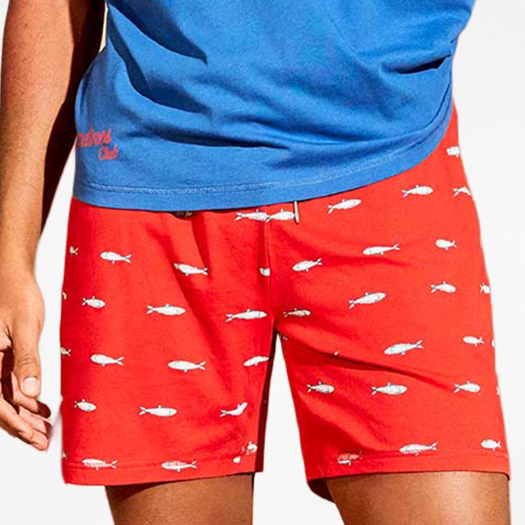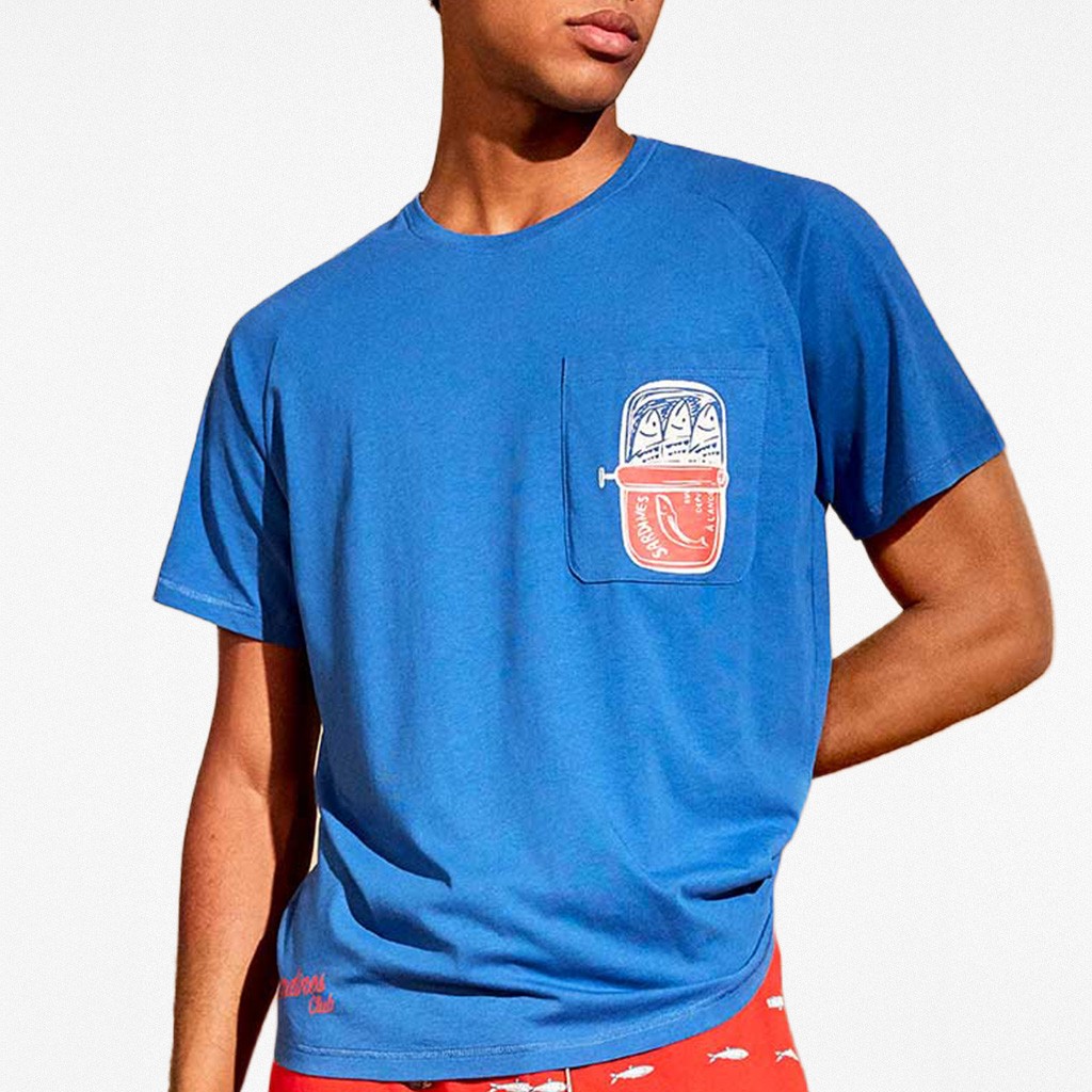 Pijama de hombre compuesto por camiseta de manga corta con detalle bolsillo en el pecho y pantalón corto estampado en color a contraste con bolsillos. Presentación en caja.