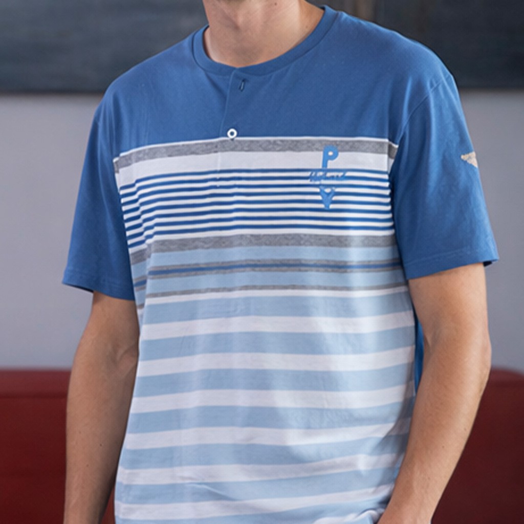Pijama de algodón para hombre que combina camiseta de manga corta a rayas con pantalón corto de color liso con bolsillos. Se envía en caja.