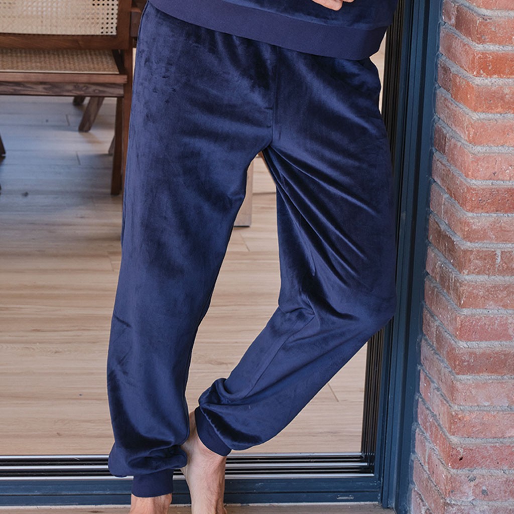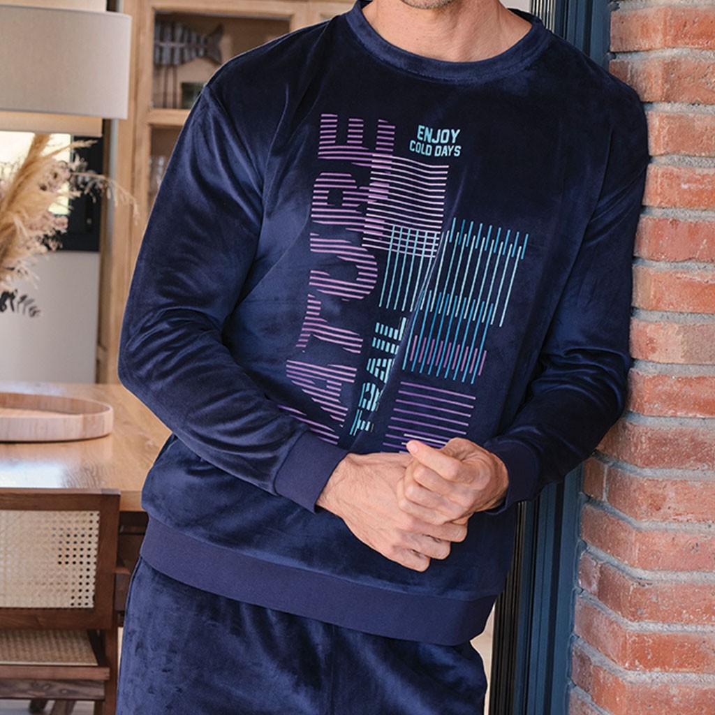 Pijama de hombre de manga largaa, confeccionado en suave y elástico tejido en color marino, de la marca Muslher, con puños y dibujo delantero. Presentado en caja.