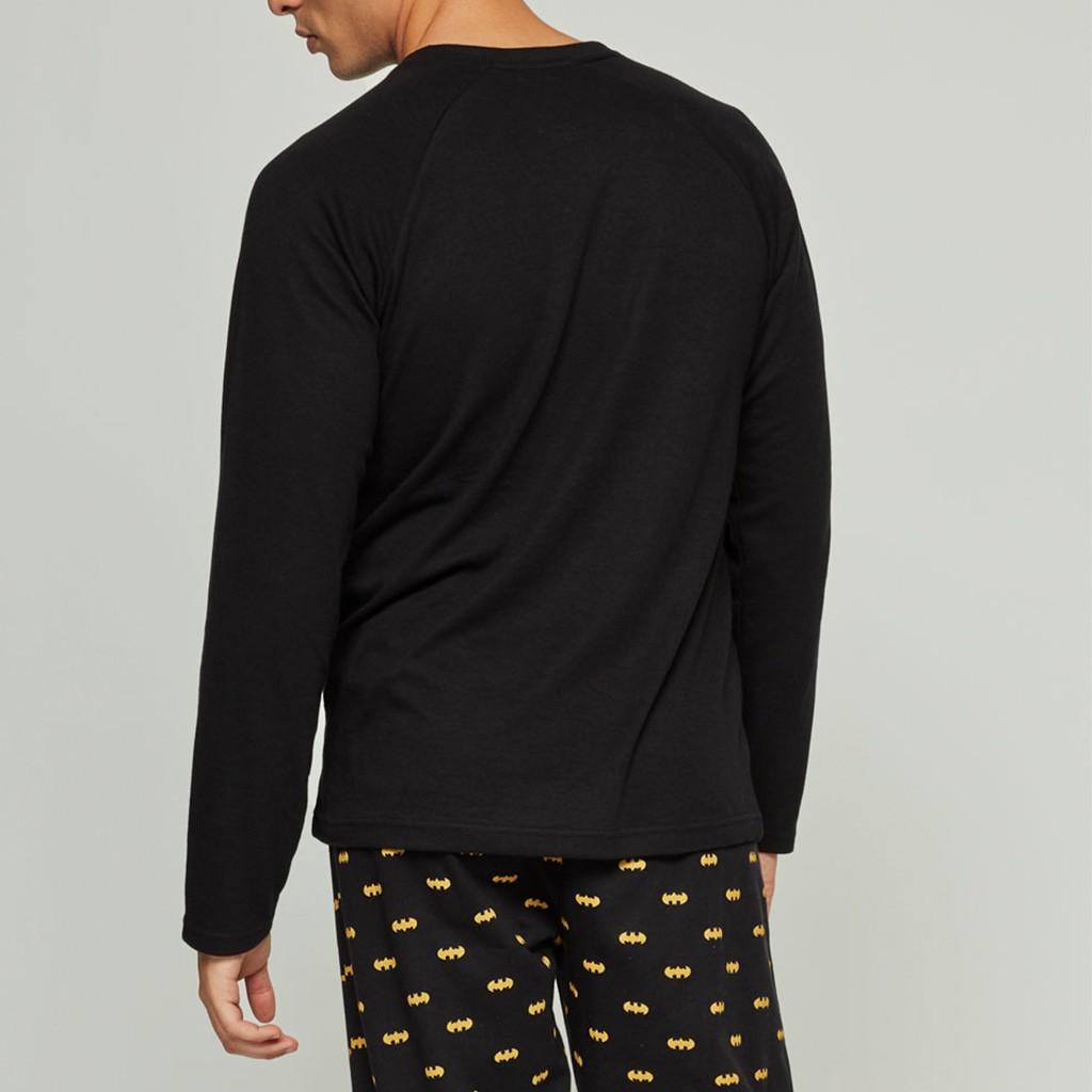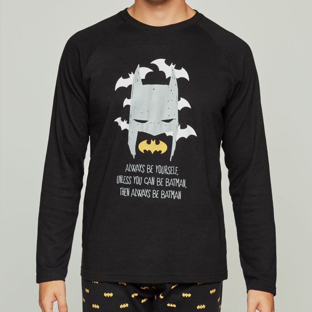 Pijama para hombre de la marca Gisela, camiseta de manga larga y cuello redondo con dibujo en el pecho a juego con pantalón largo estampado con el simbolo de Batman. Se envia en una precios lata de regalo.