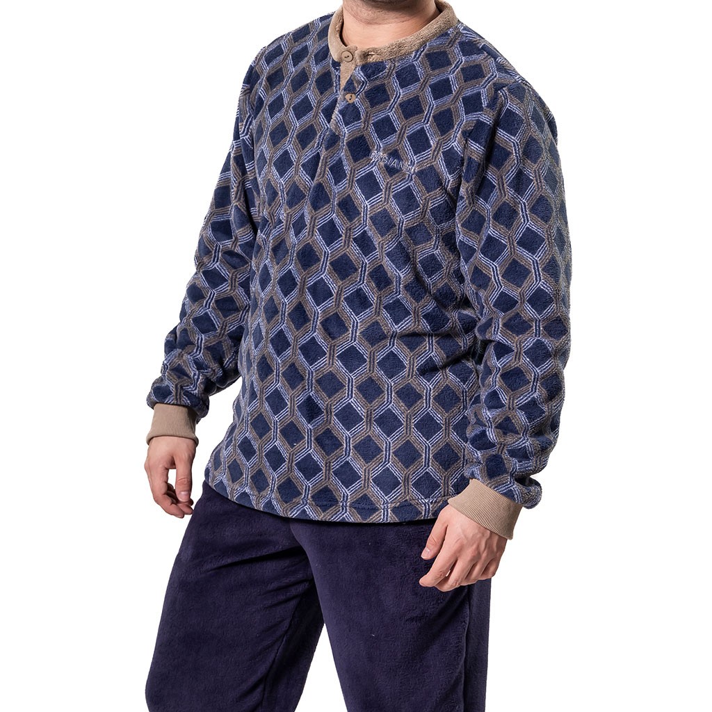 Pijama largo de hombre compuesto por camiseta estampada con cuello de botones y pantalón con puños en bajo, confeccionado en cálido tejido suave. Marca Fabianni. Presentado en caja.