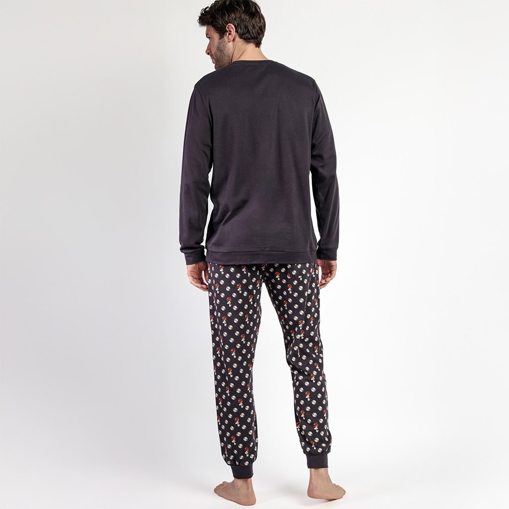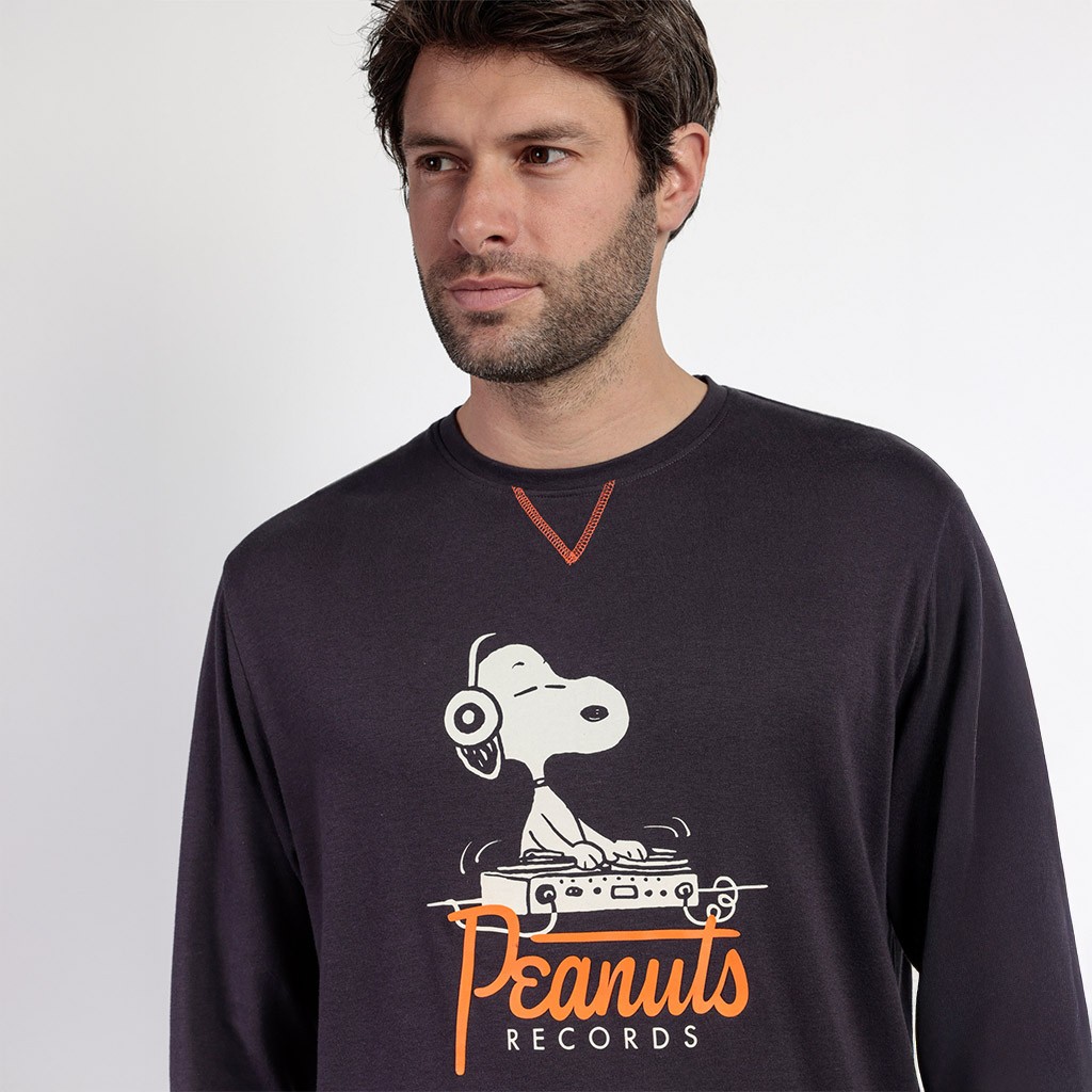 Pijama de hombre con camiseta de Snoopy en manga larga y con cuello redondo que combina con pantalón largo estampado y con puños en bajo. Presentado en caja con diseño Peanuts.