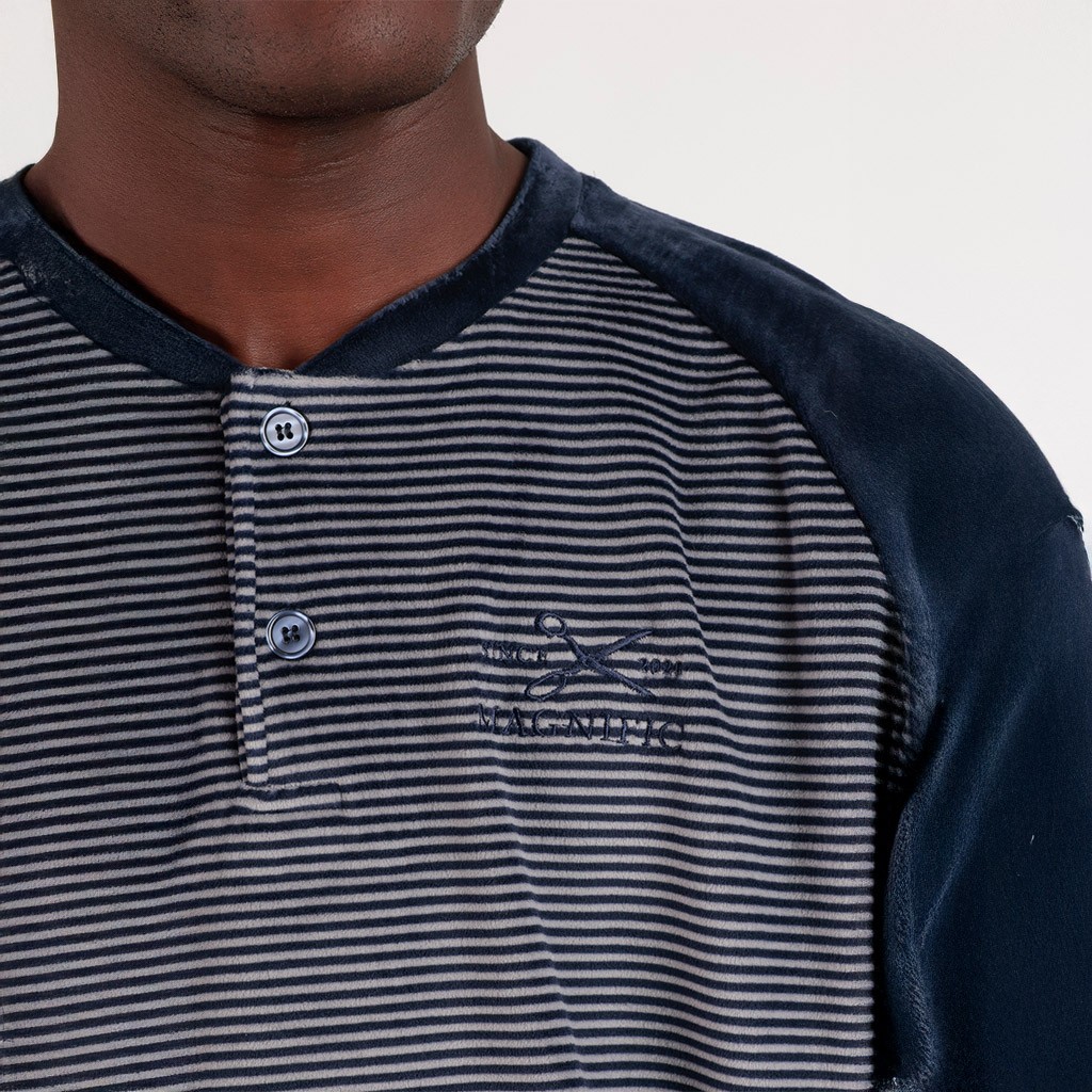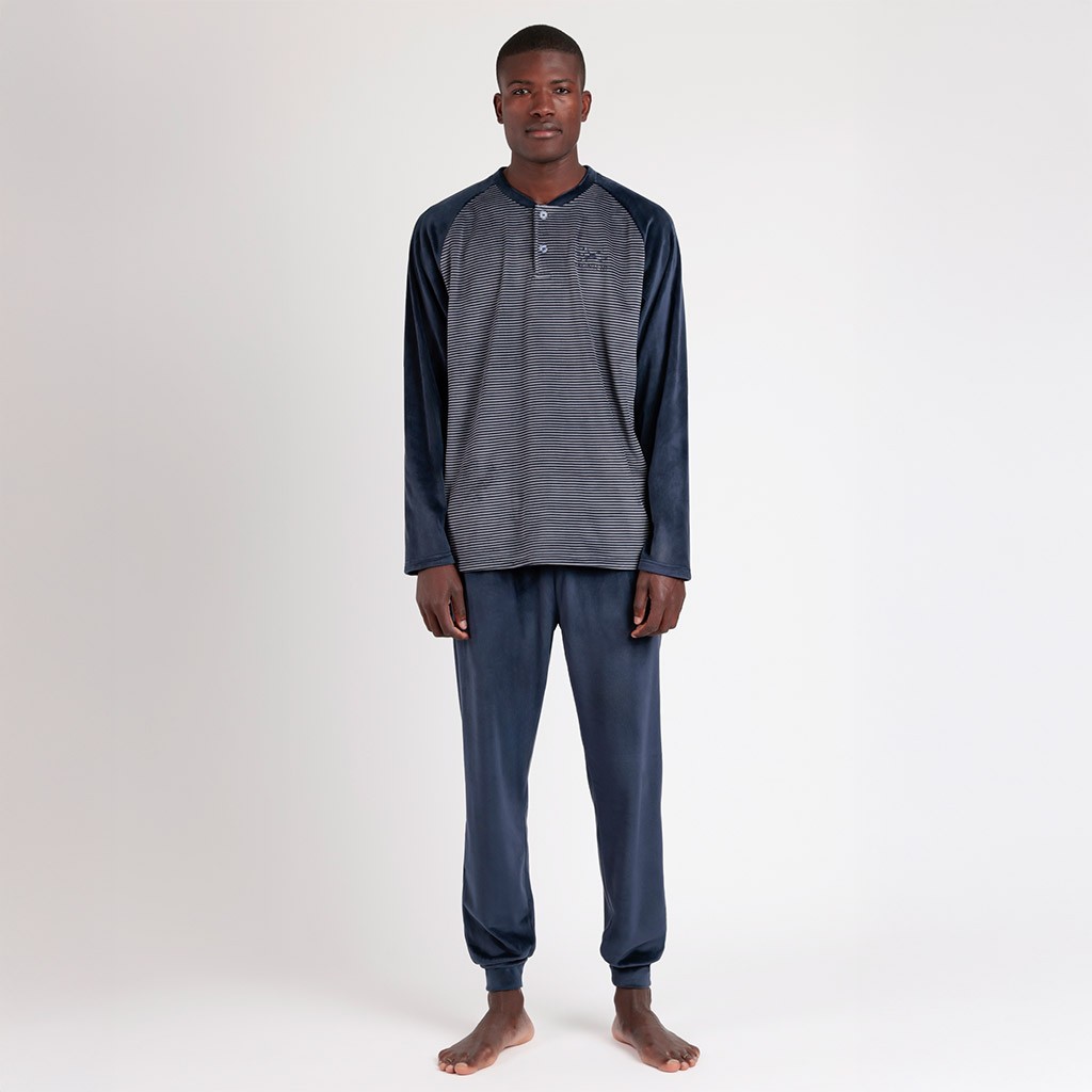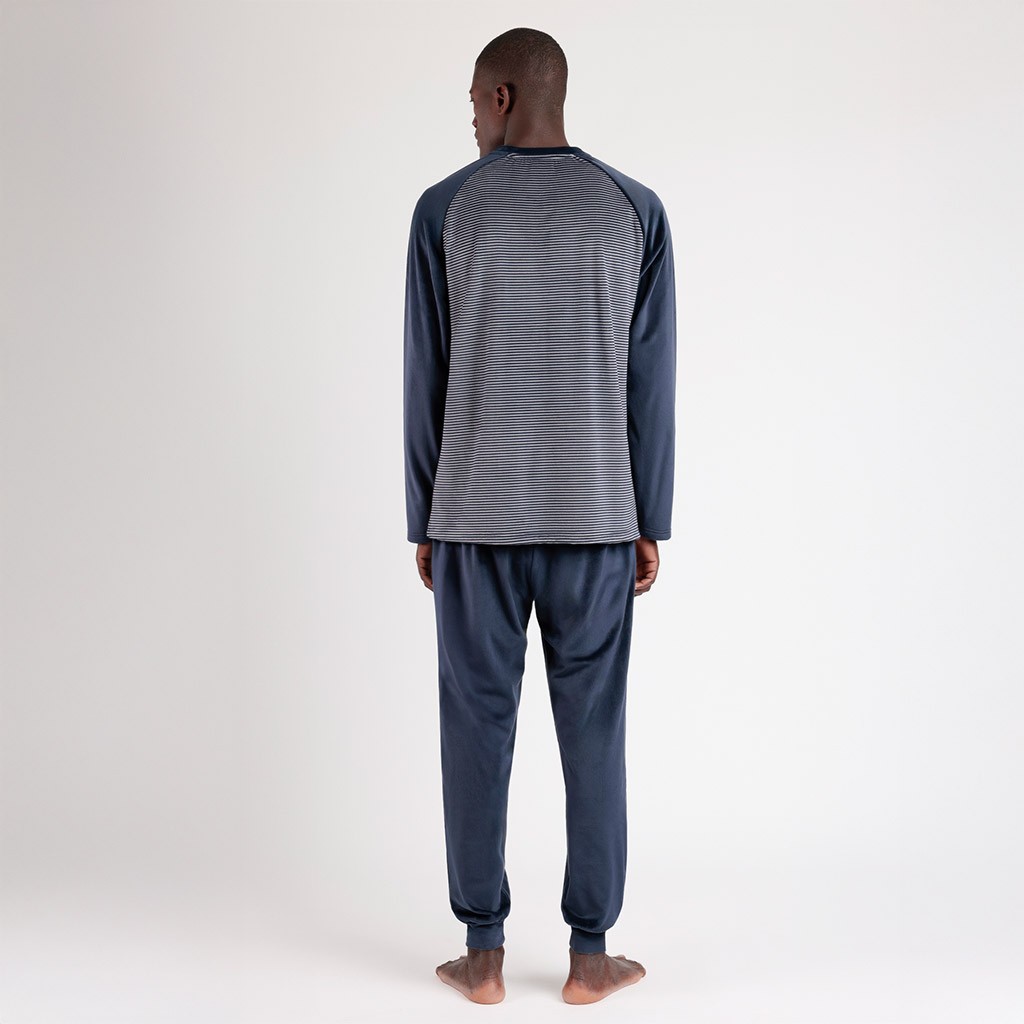 Pijama de hombre de la marca Admas, compuesto por camiseta con cuello de botones y pantalón liso con puños confeccionado en tejido spandex. Presentado en caja.