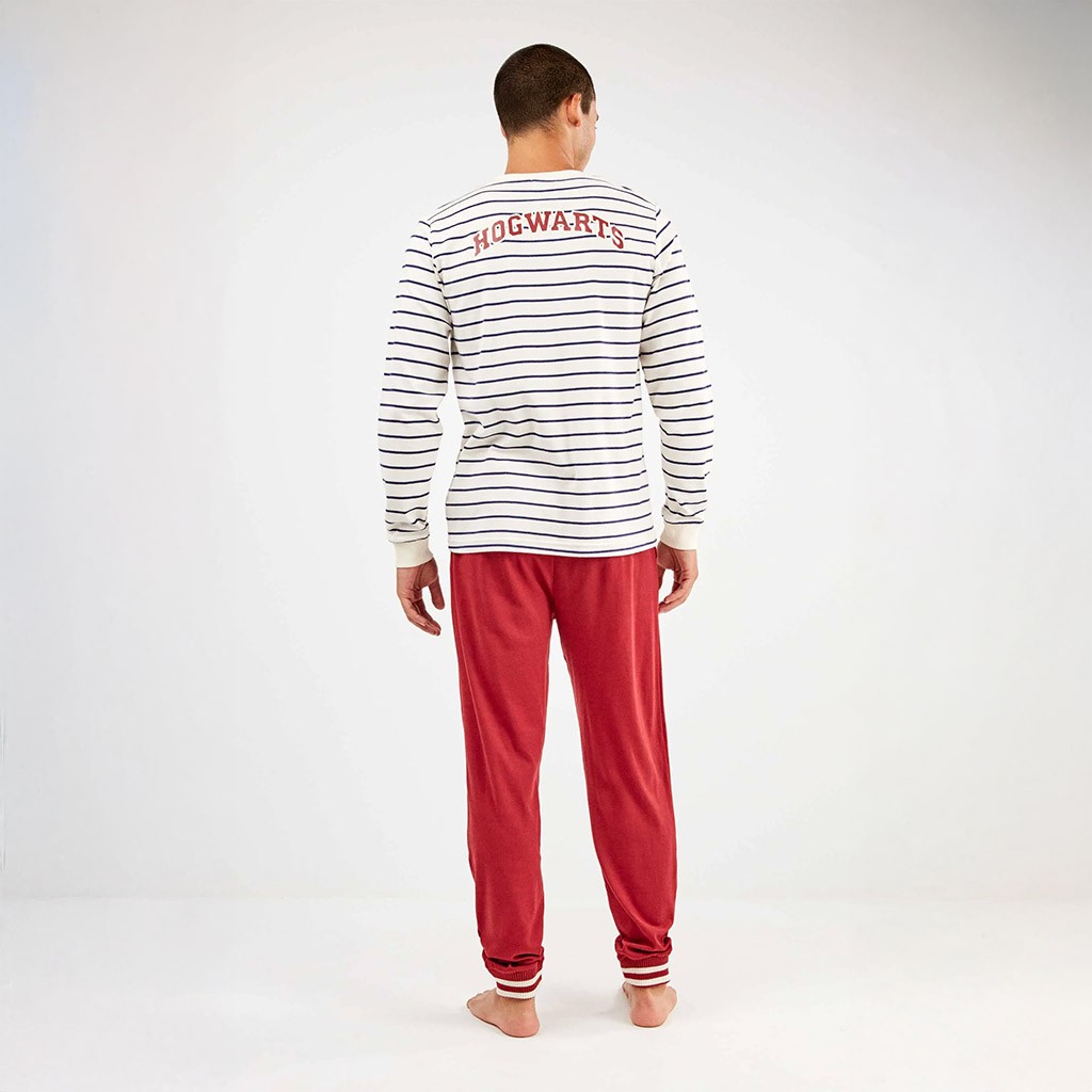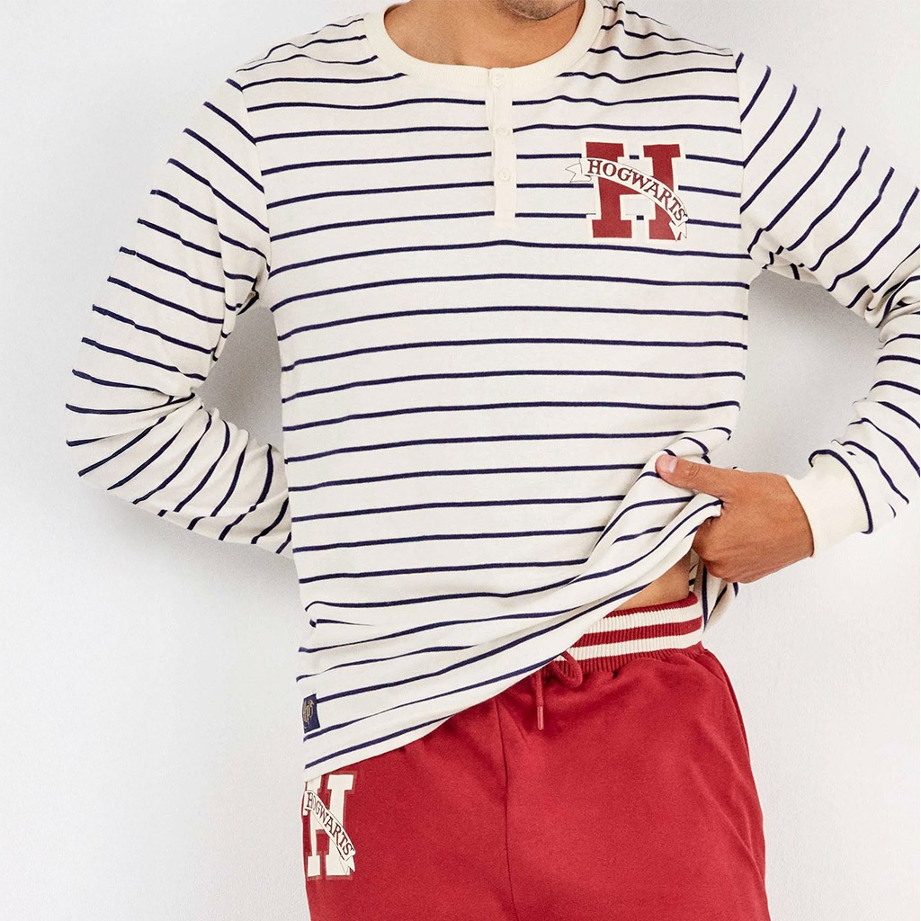 Pijama de hombre con camiseta de rayas y cuello redondo con botones con logo en el pecho de Harry Potter a juego con el pantalón largo en color rojo con puños elásticos. Presentado en caja con diseño Howards.