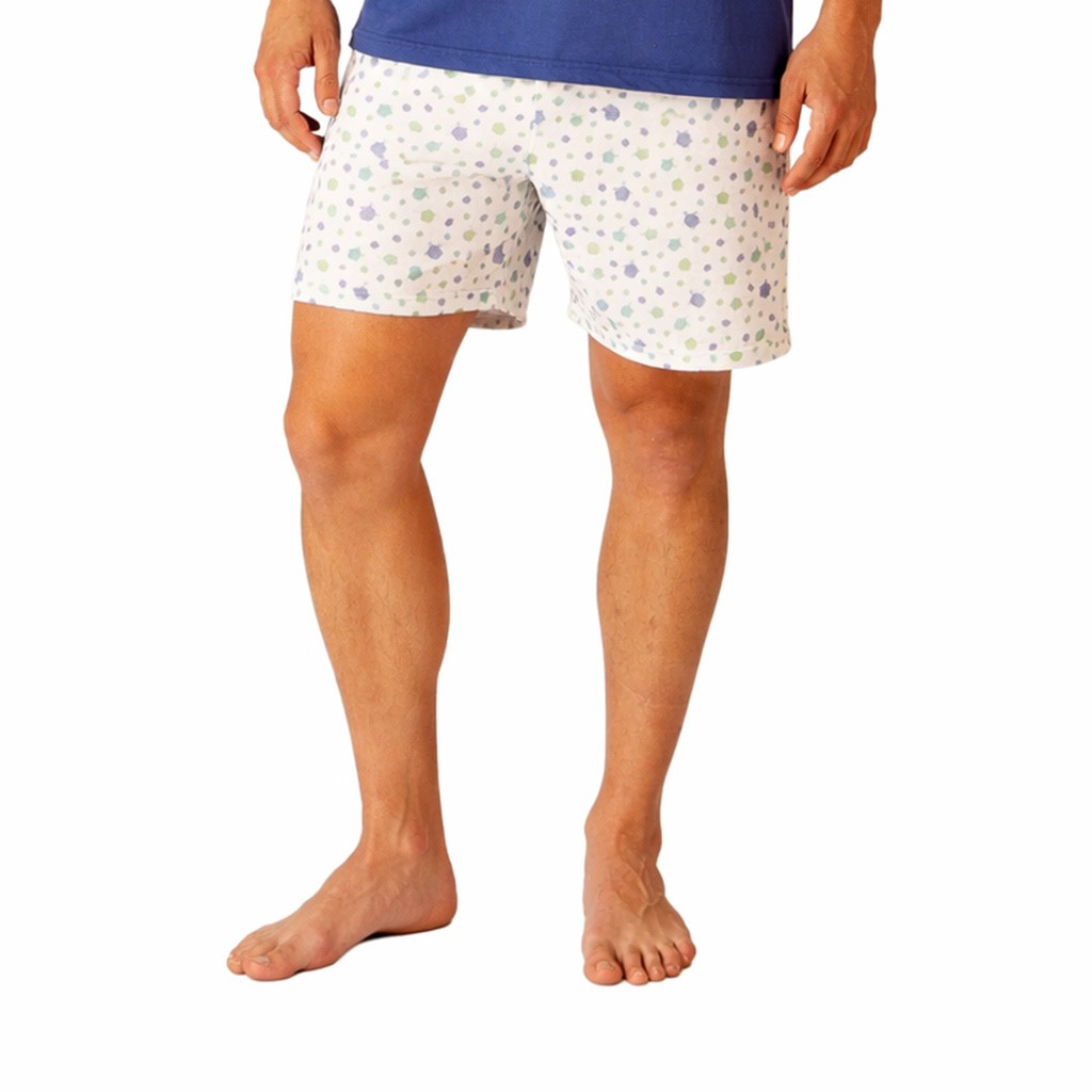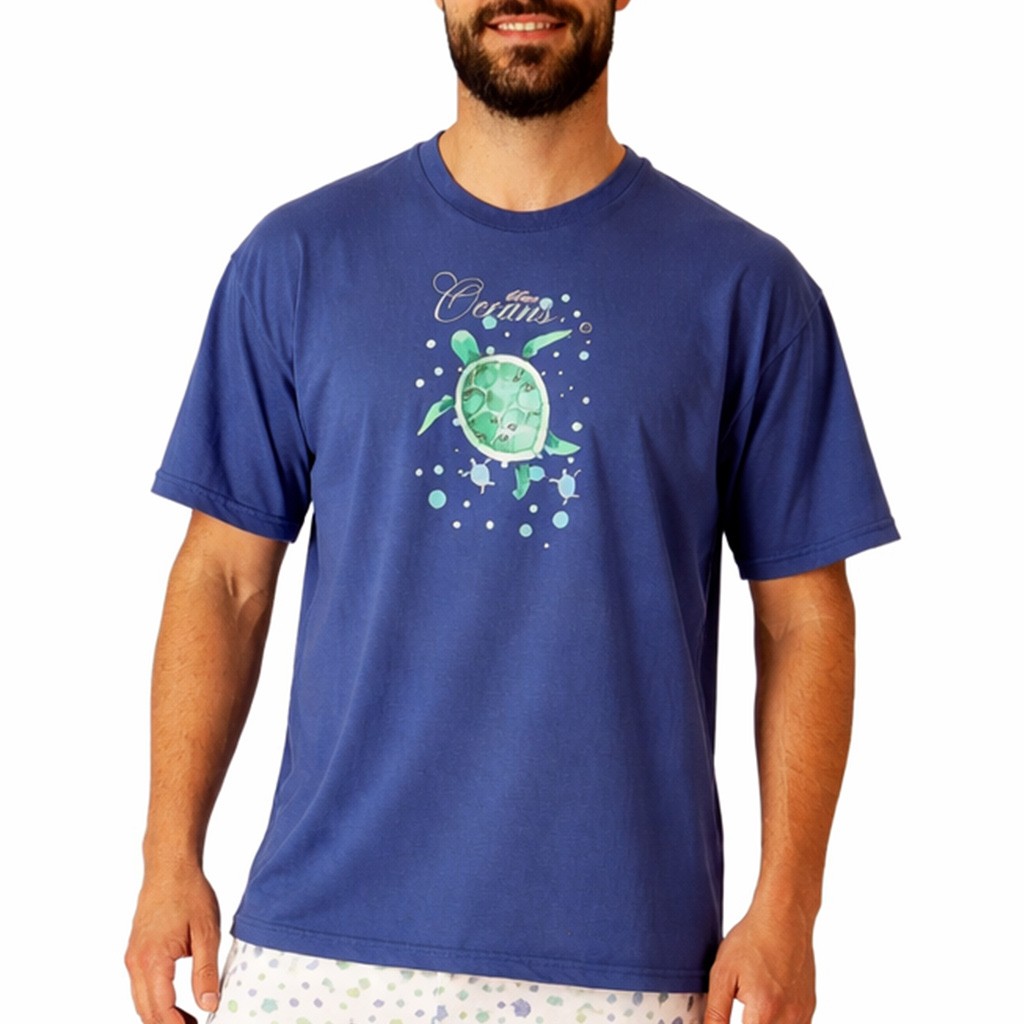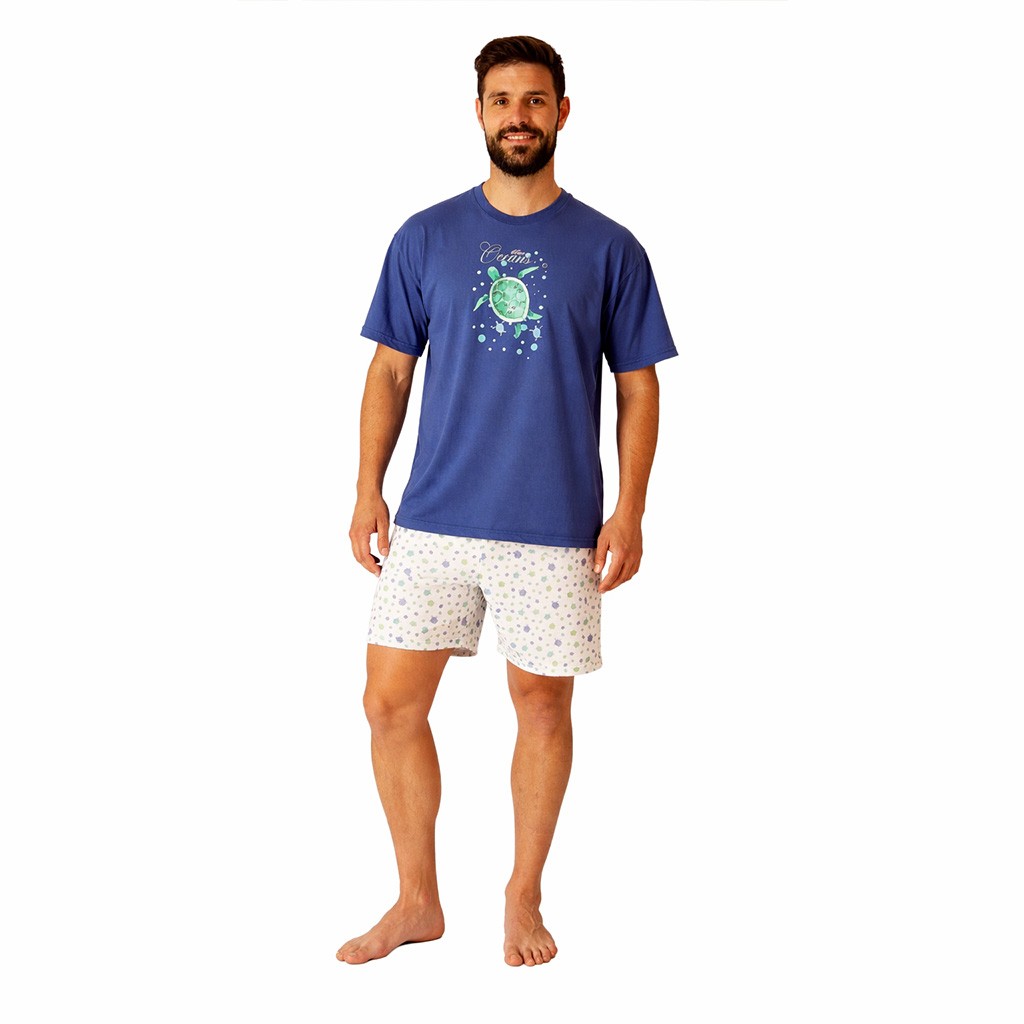 Pijama corto de hombre en tejido de algodón con camiseta de manga corta con dibujo delantero y cuello redondo y pantalón estampado con bolsillos laterales. Presentado en caja.
