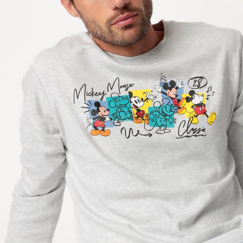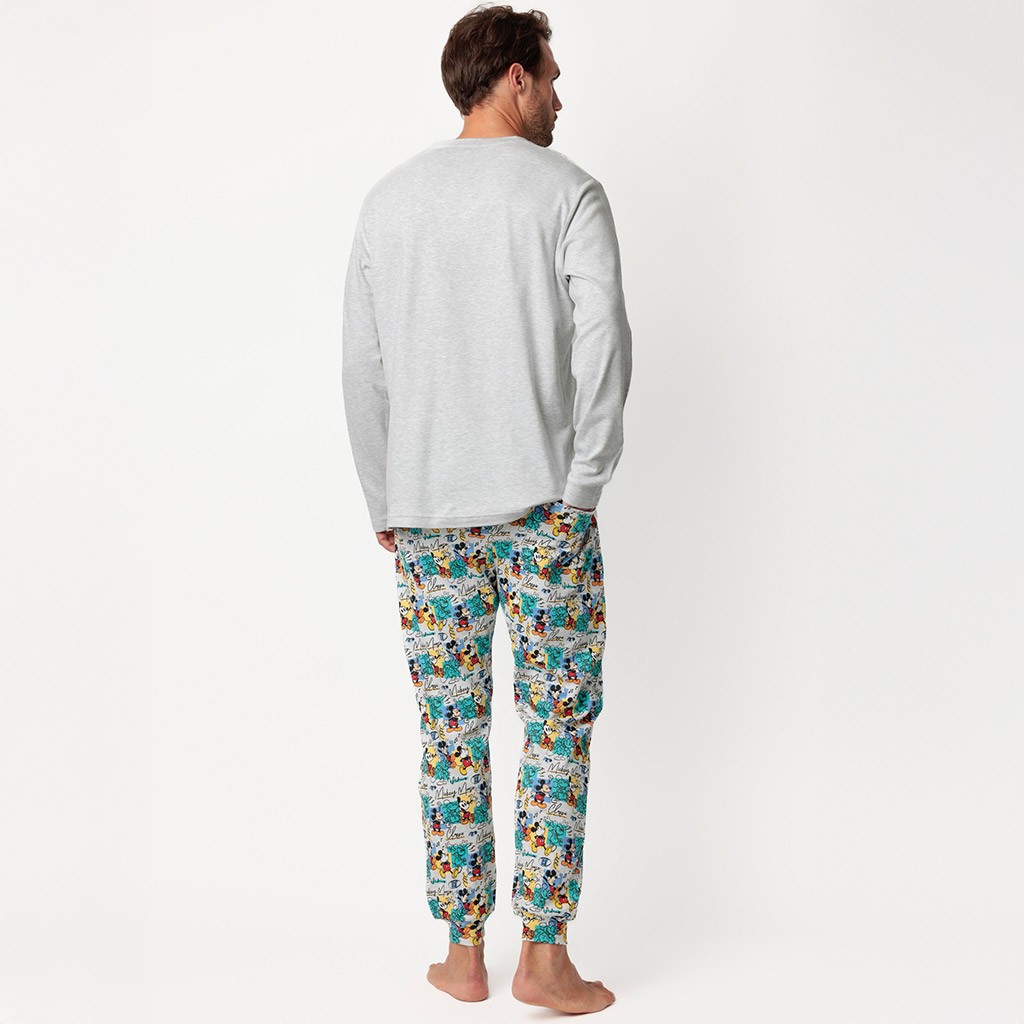 Pijama de hombre con camiseta de manga larga con dibujo en el pecho de Mickey Mouse y pantalón largo acon estampado a juego y puños en bajo. Presentado en caja con diseño Disney.