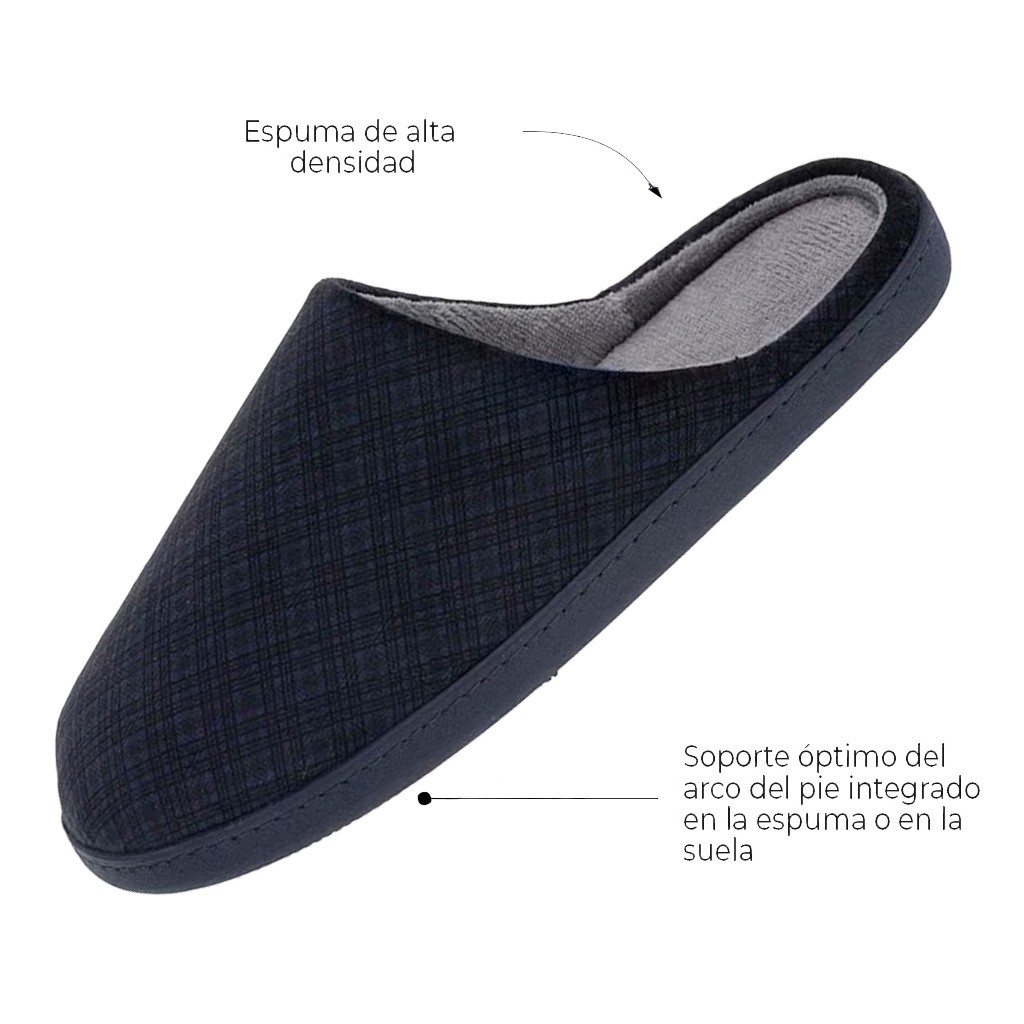 Zapatilla para hombre de de microvelour liso en color marino con detalles de fantasia. Plantilla ergonómica de espuma con memoria que se adapta a la forma del pie para un confort máximo y garantizando un apoyo eficaz del pie